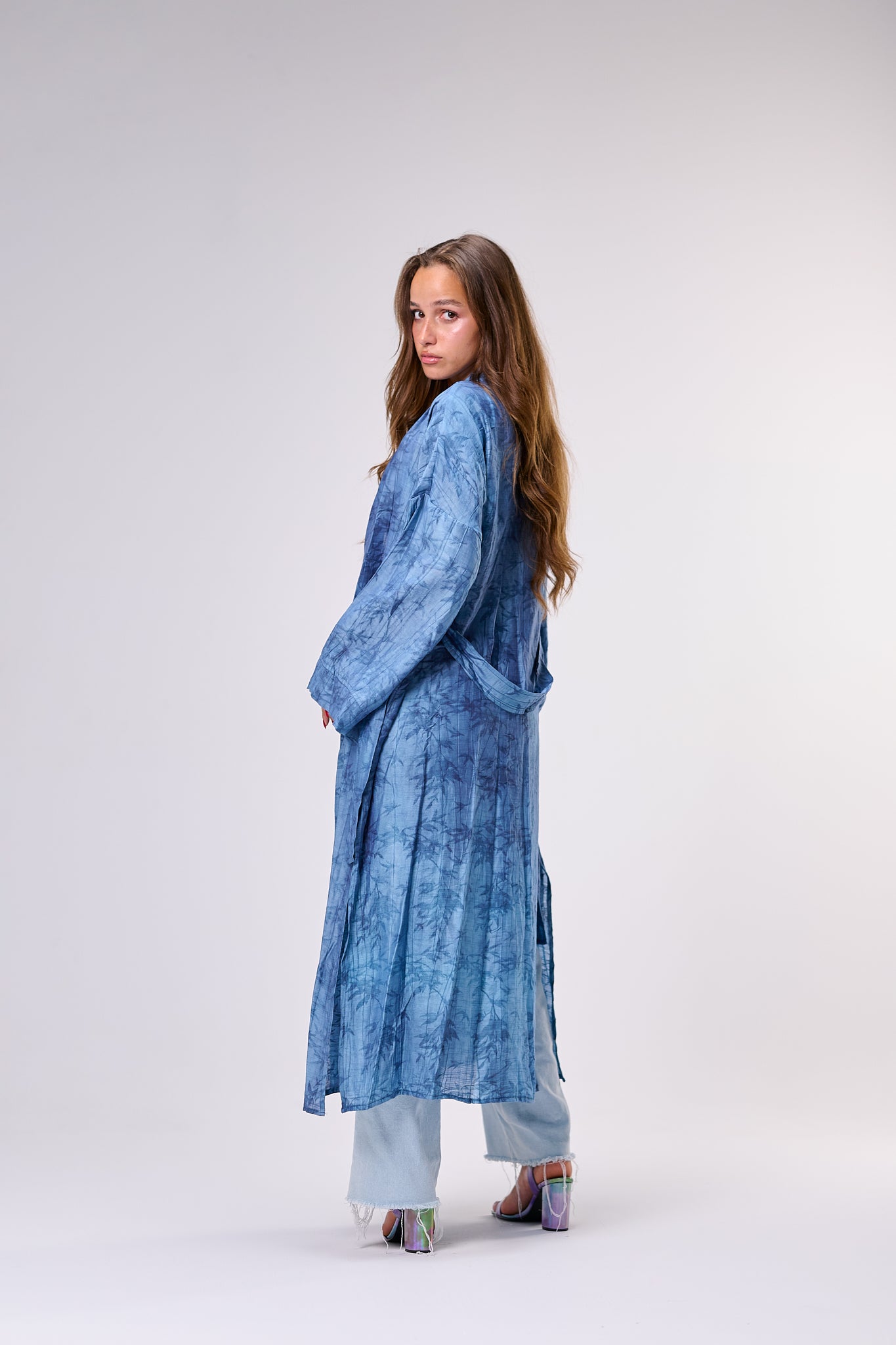 This long kimono blends soft crinkled fabric with subtle textured patterns and a delicate tie-dye wash for a unique, artisanal look.