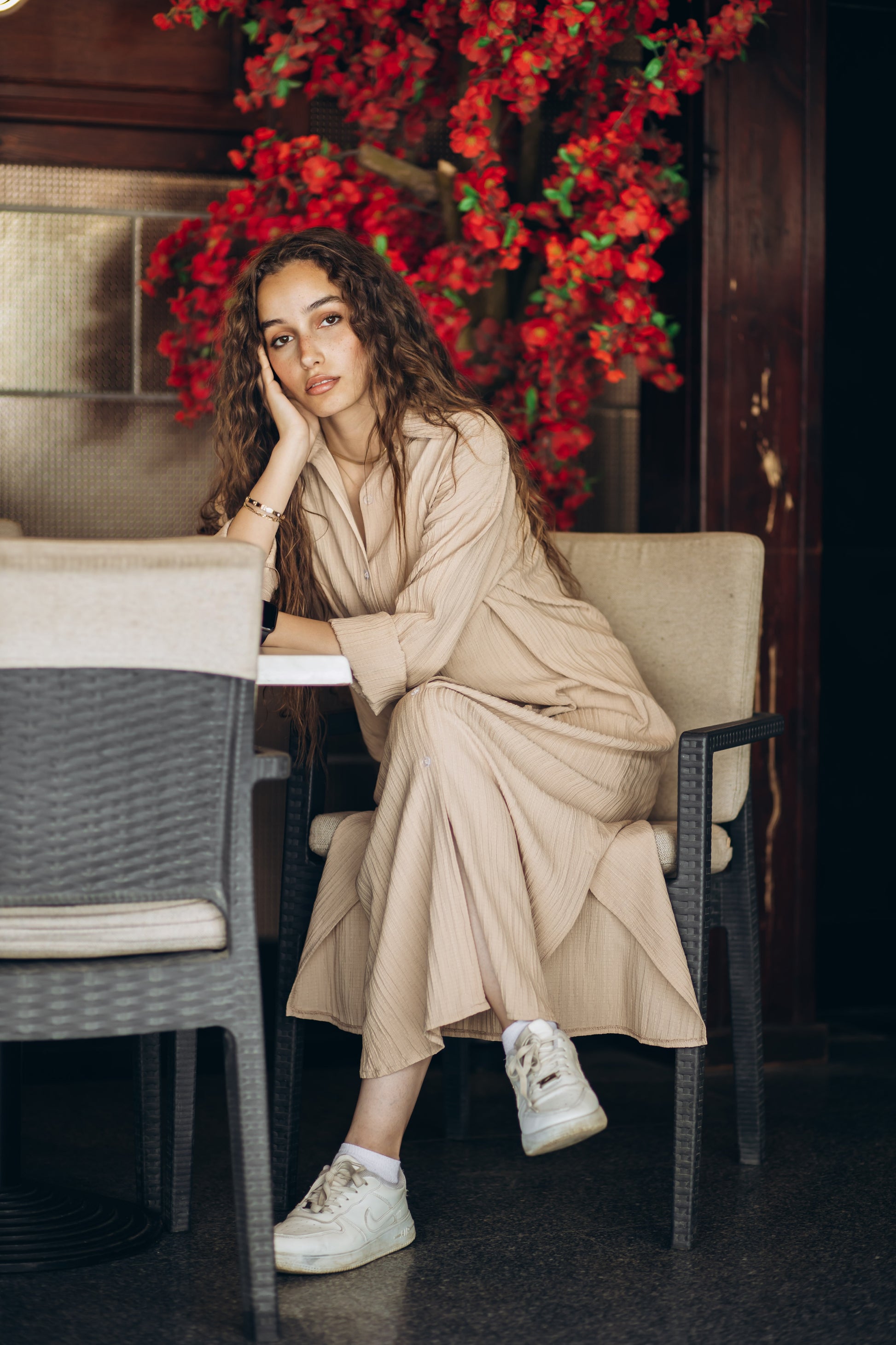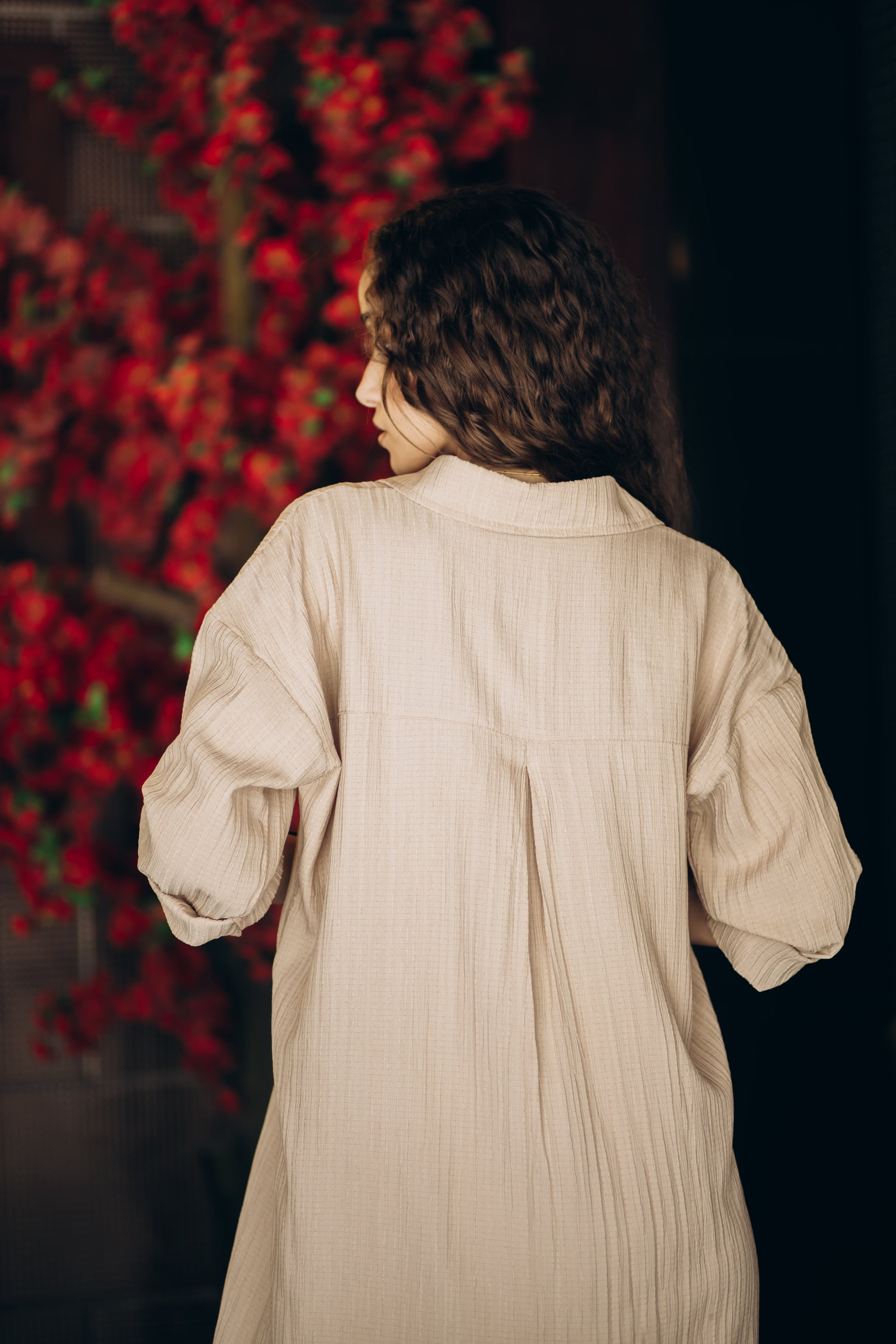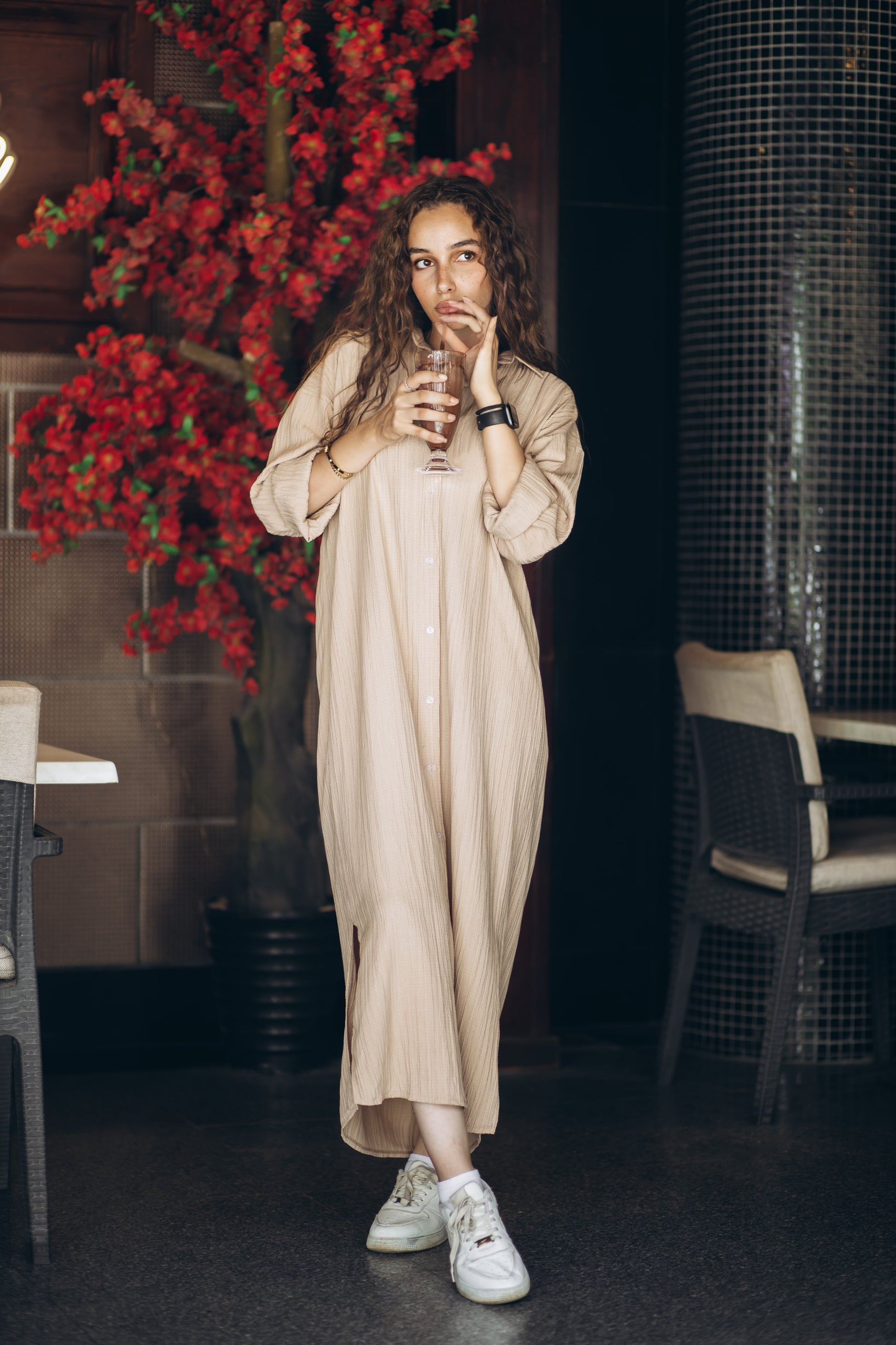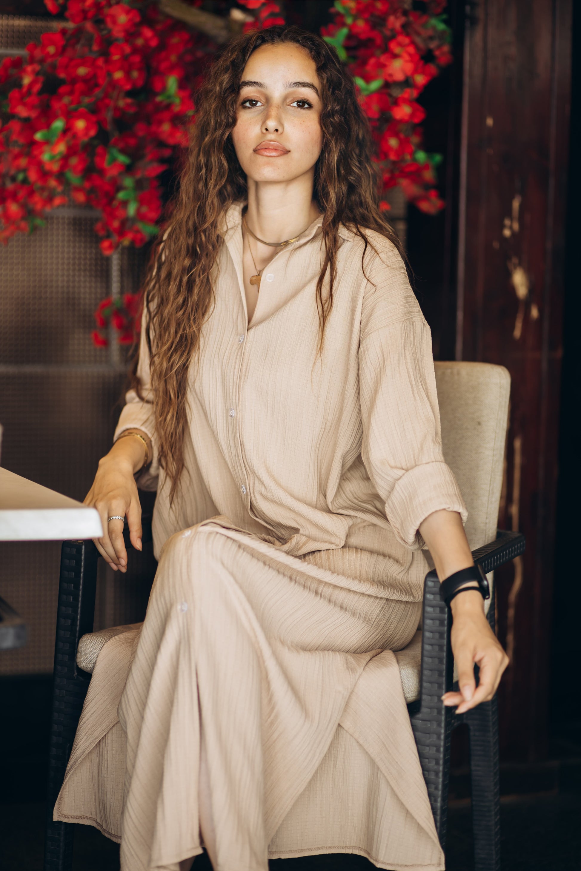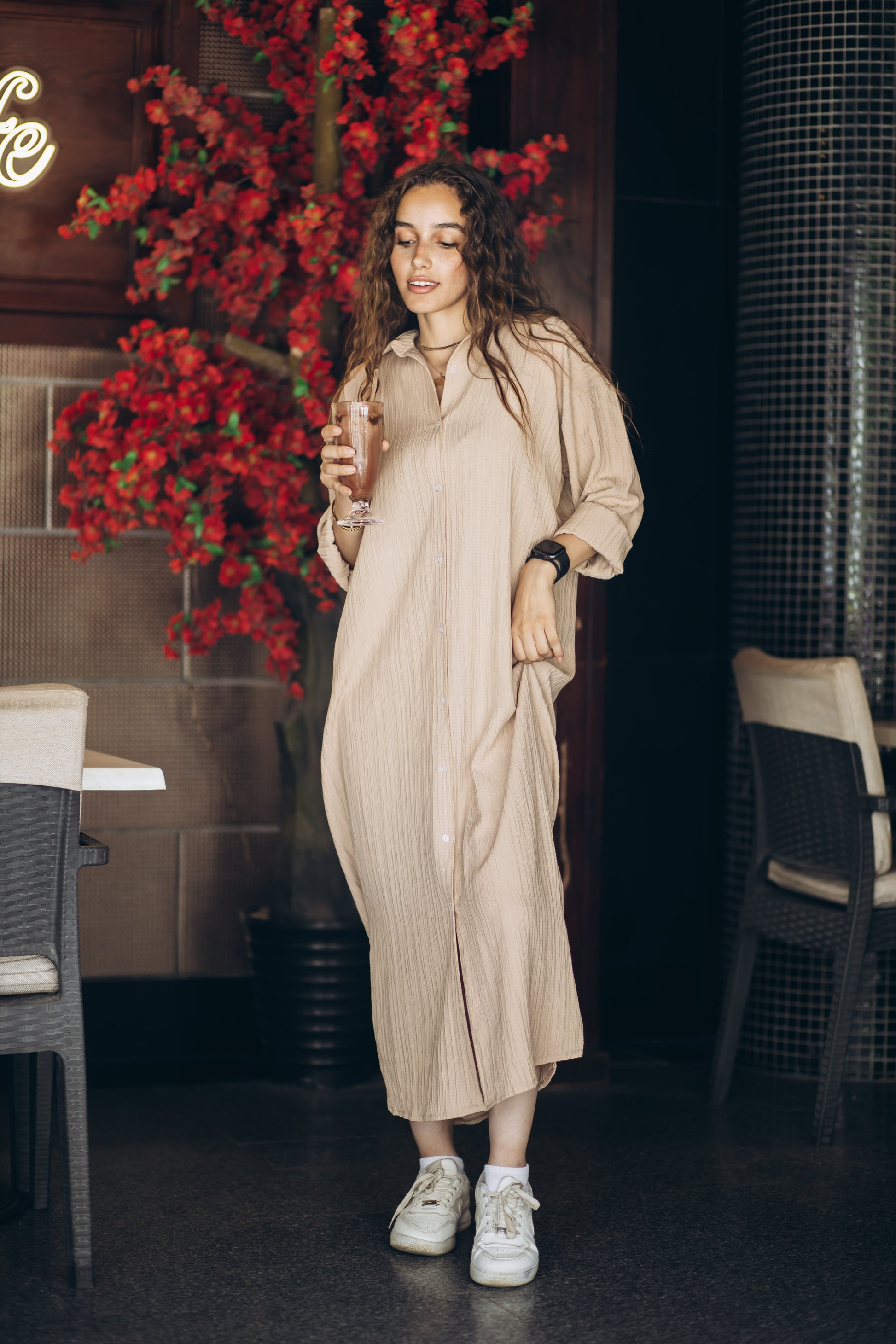 Ribbed Linen Oversized Loose Maxi Shirt Dress in " beige"
