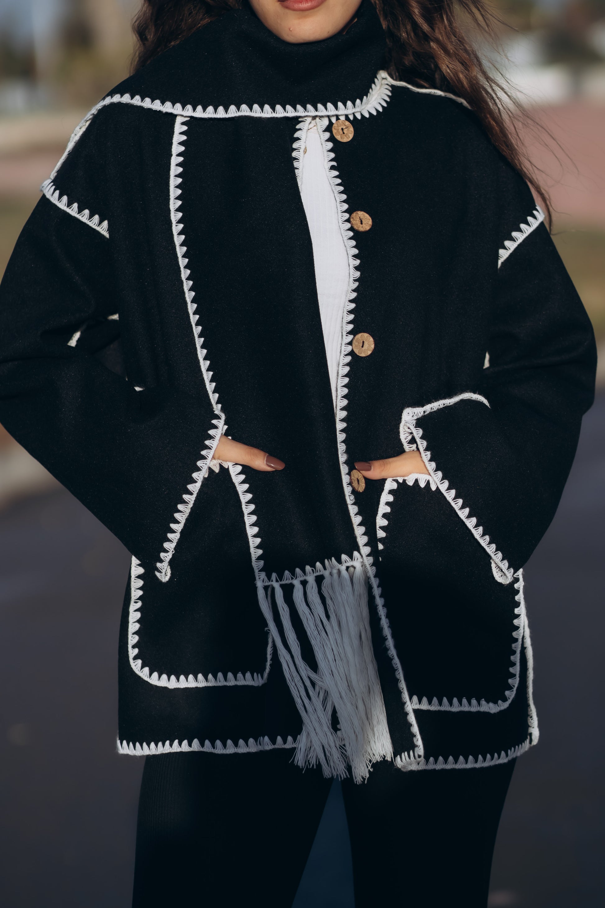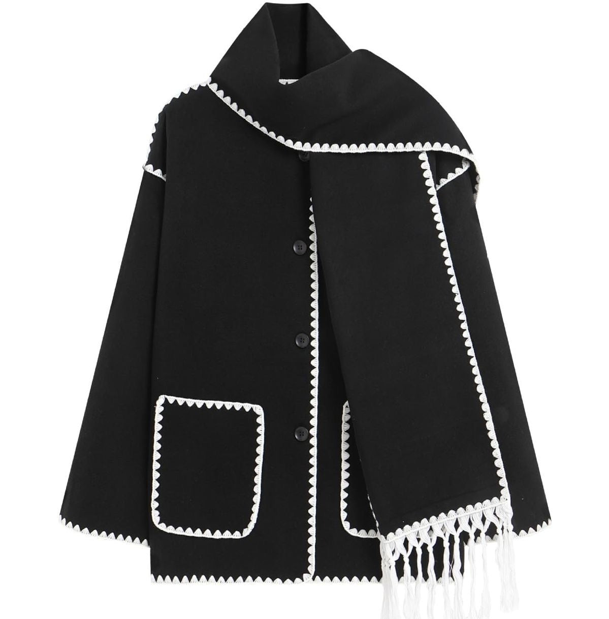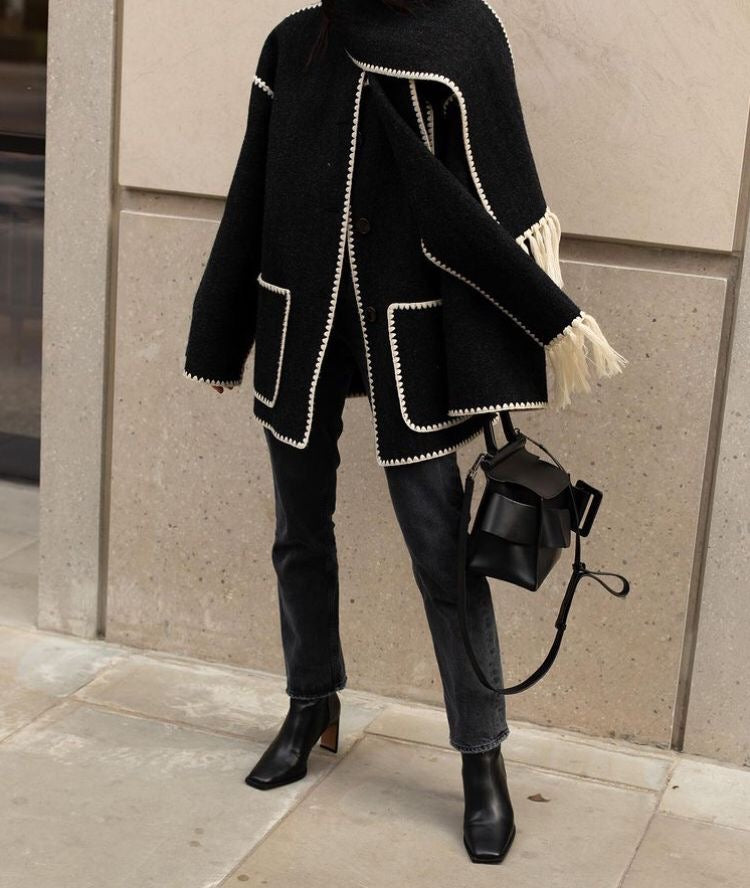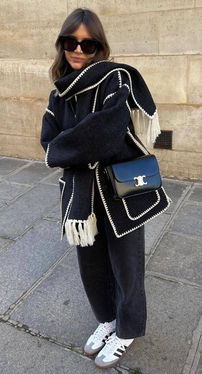 This jacket has embroidered edges with woolen threads and comes with a fringed scarf, adding a stylish and cozy touch.