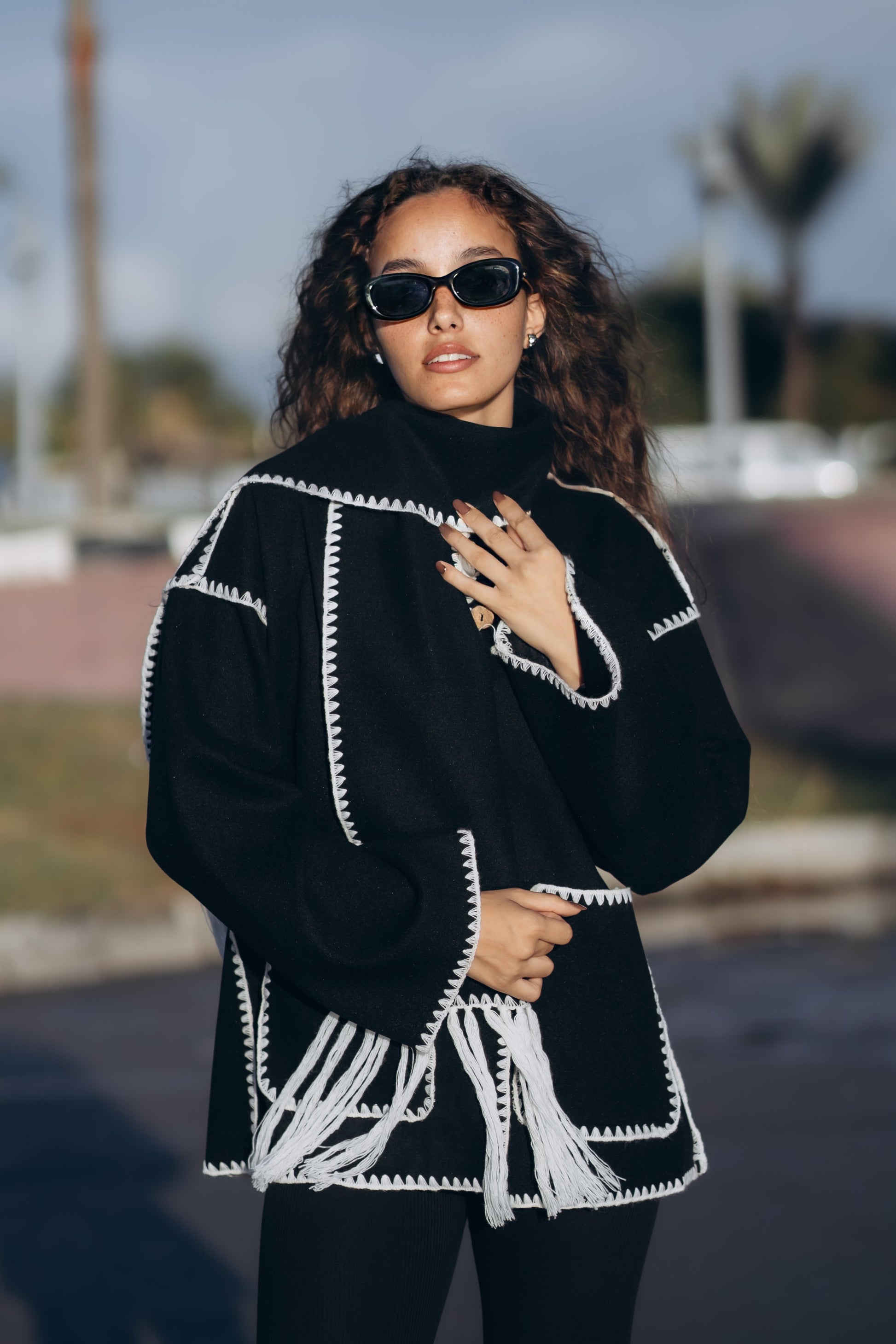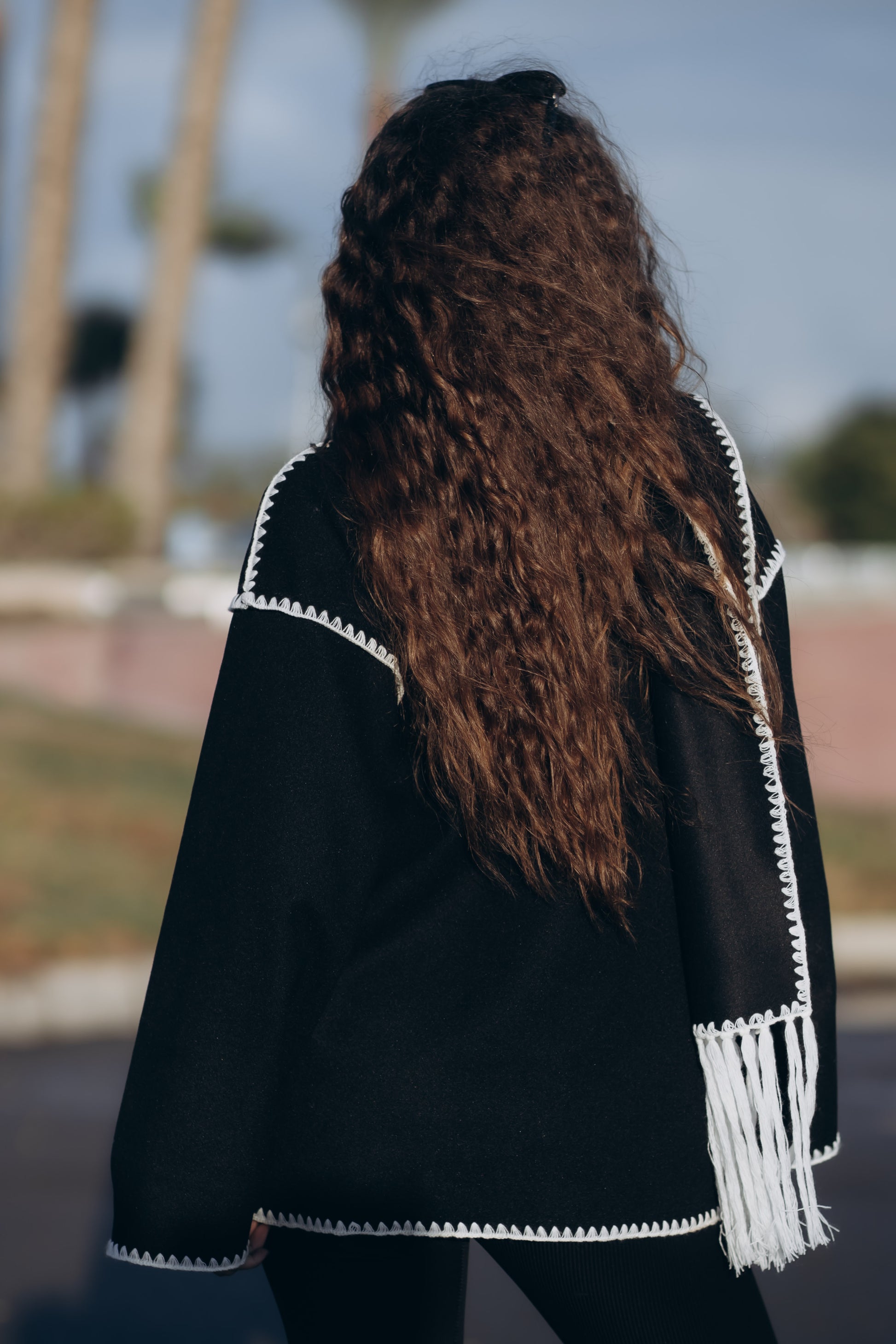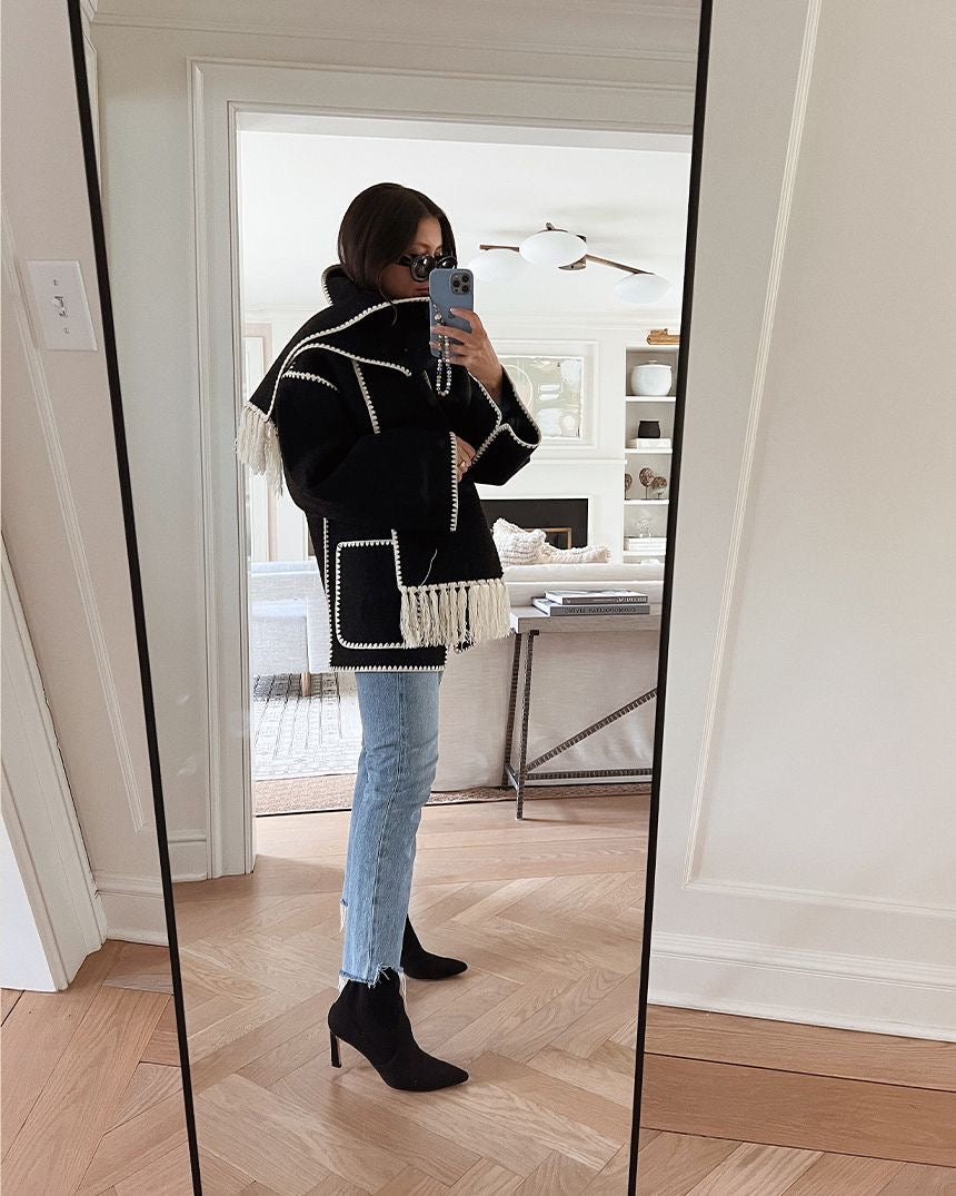 This jacket has embroidered edges with woolen threads and comes with a fringed scarf, adding a stylish and cozy touch.