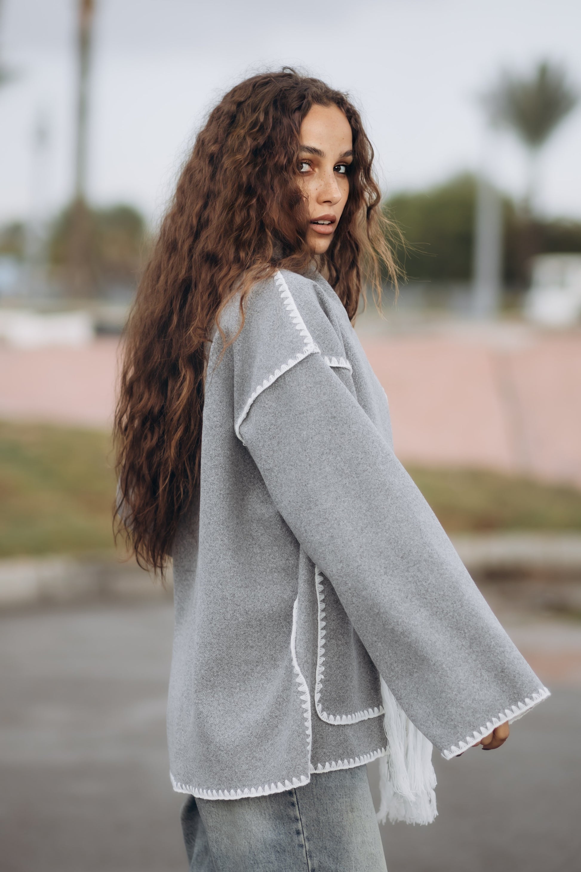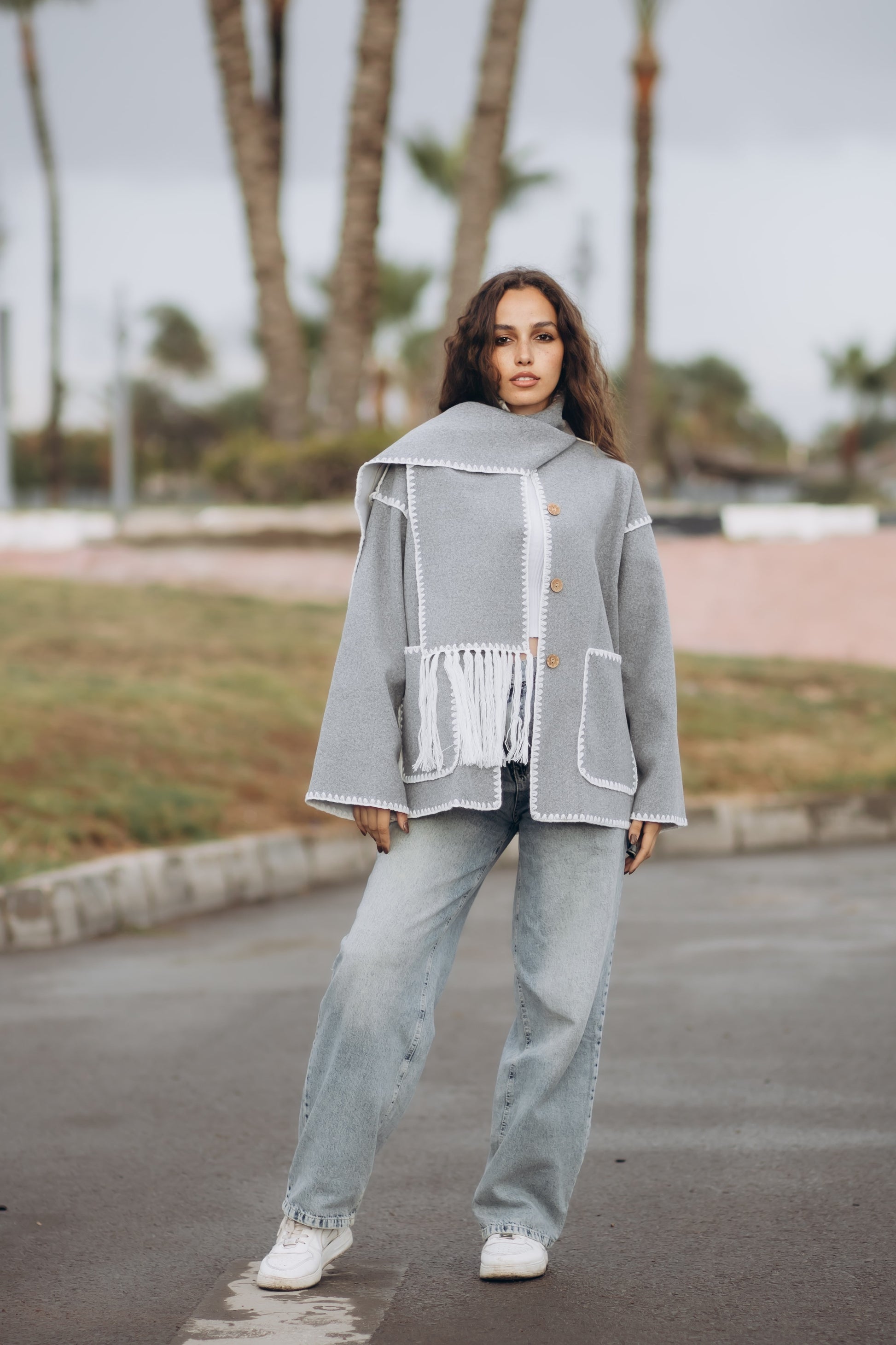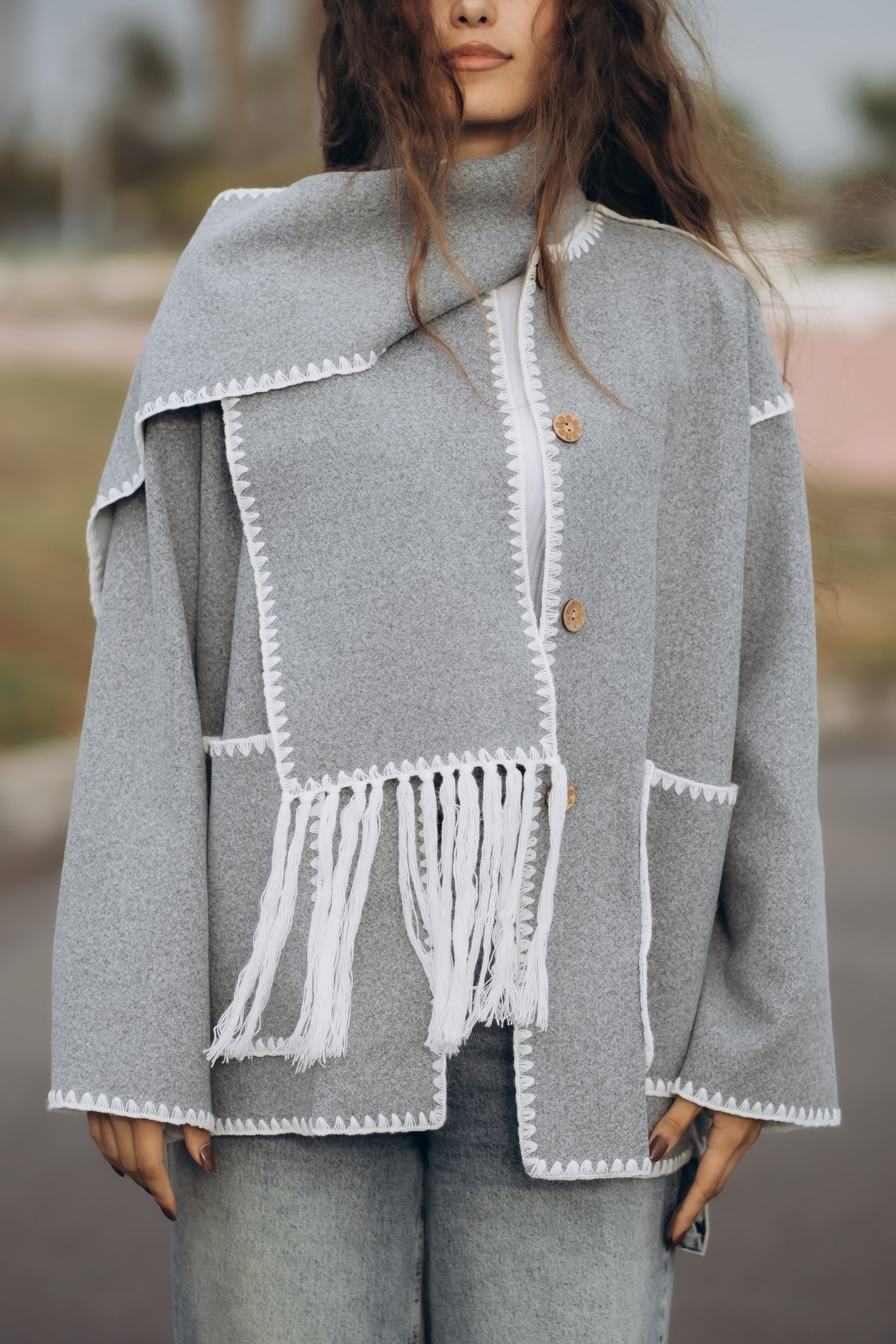 This jacket has embroidered edges with woolen threads and comes with a fringed scarf, adding a stylish and cozy touch.