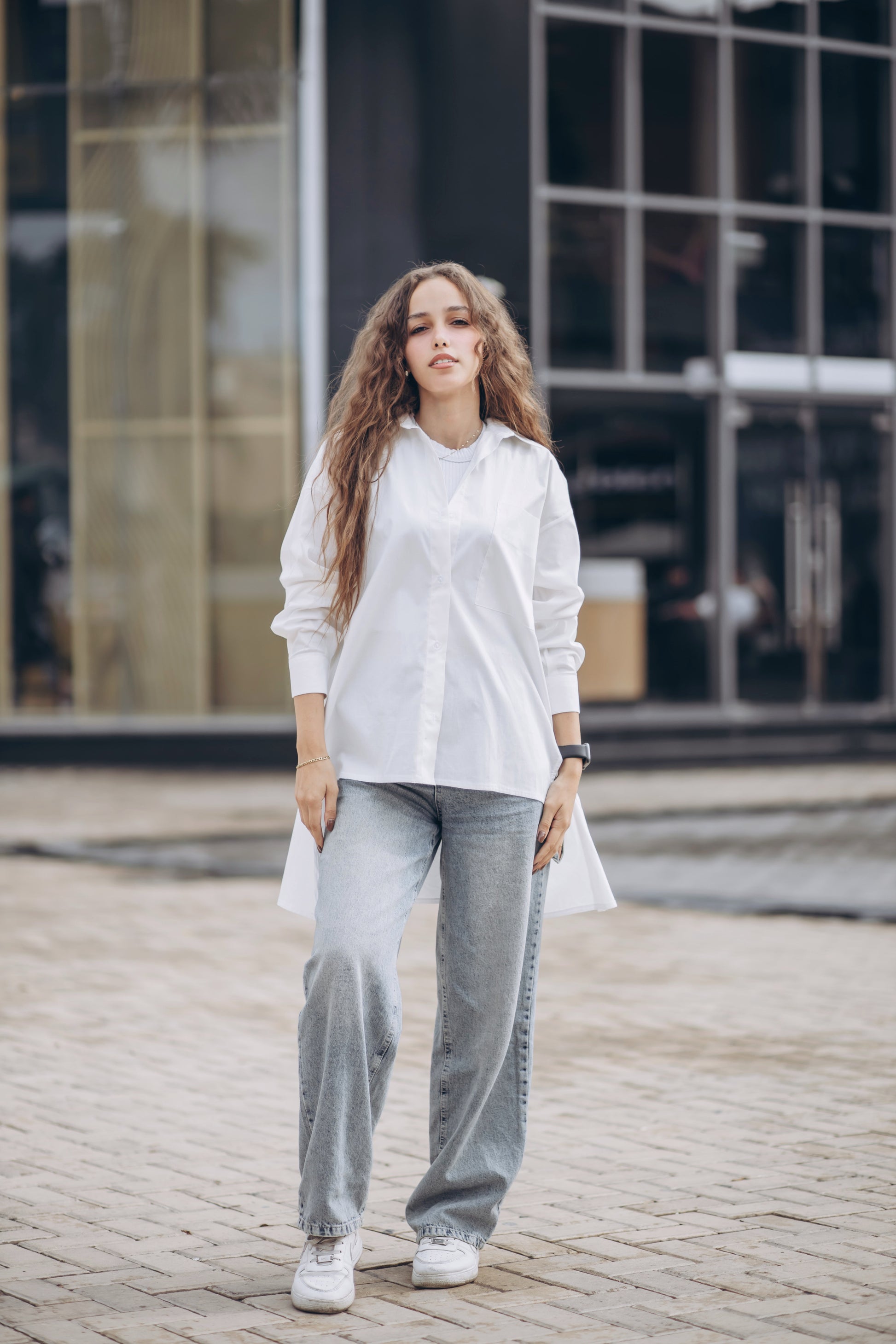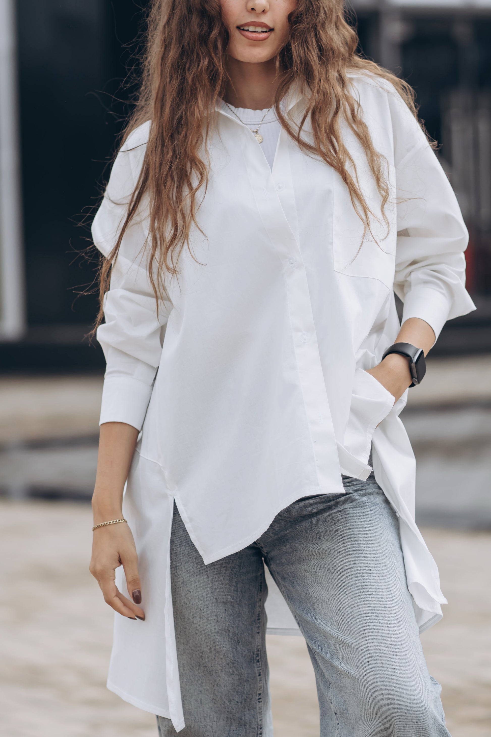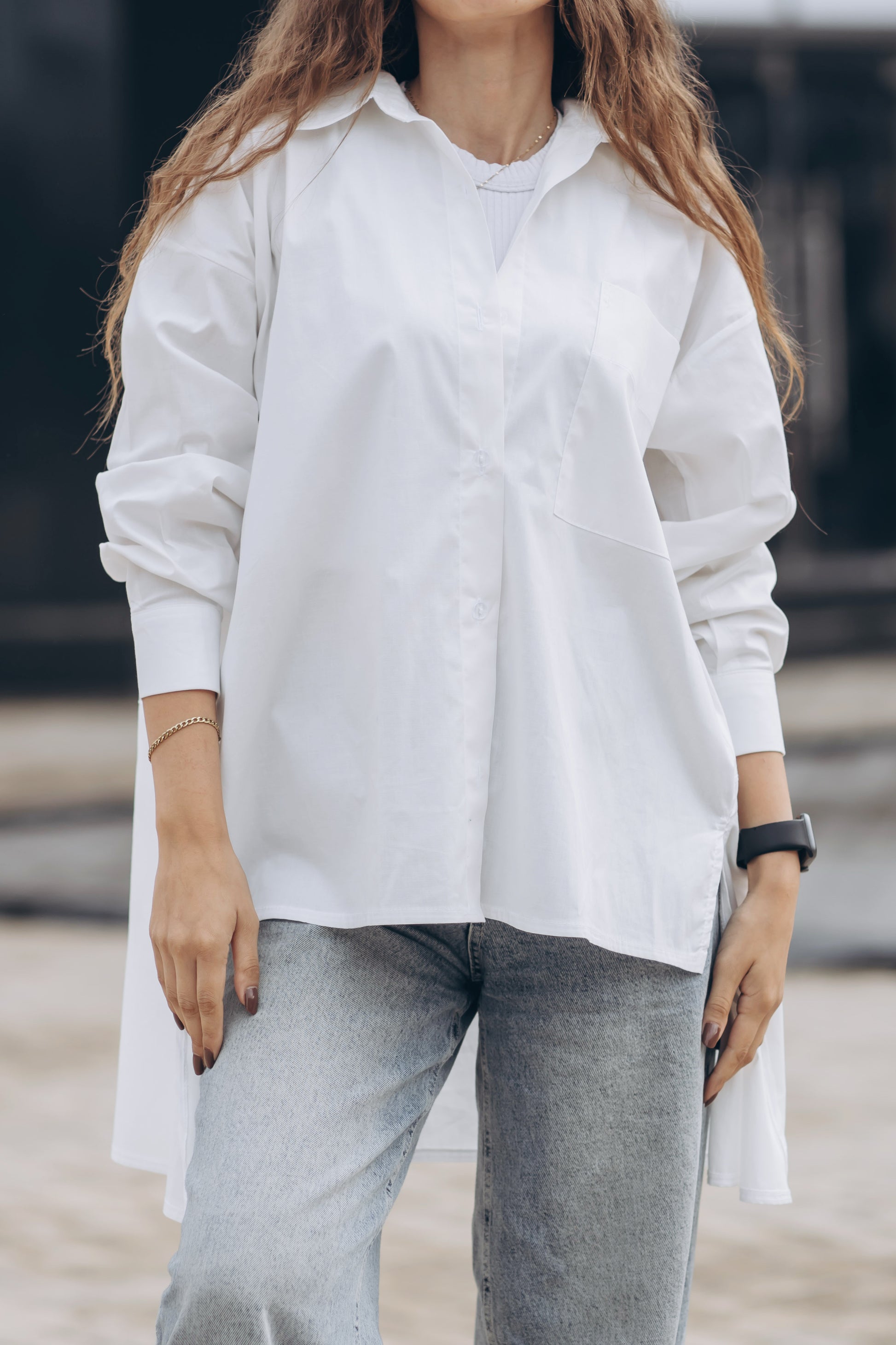 Cotton Blouse – High-Low Design with Sheer Buttons & Oversized Pocket