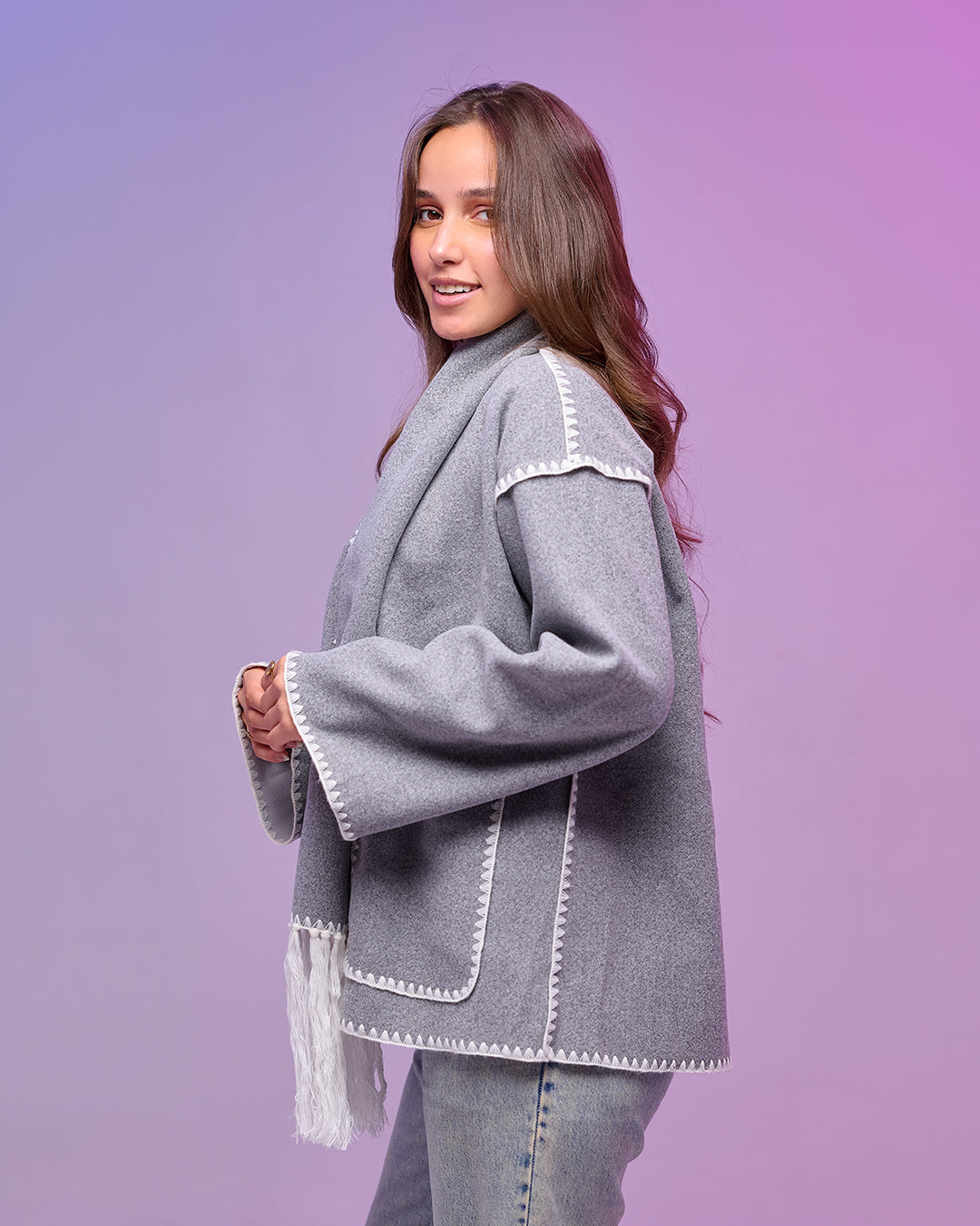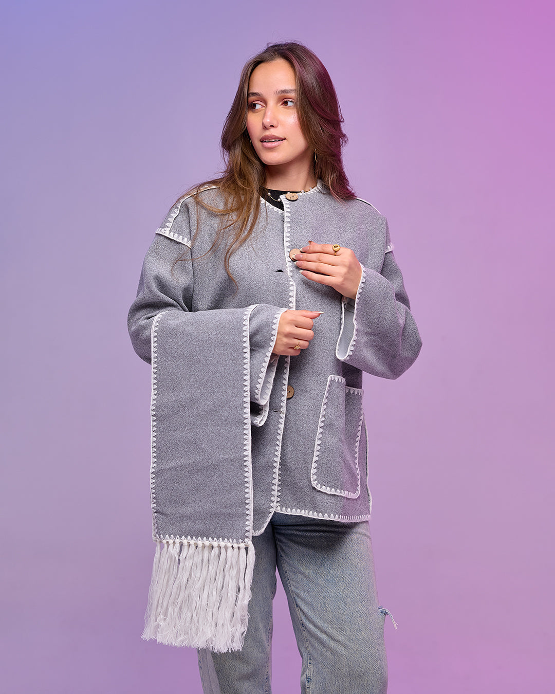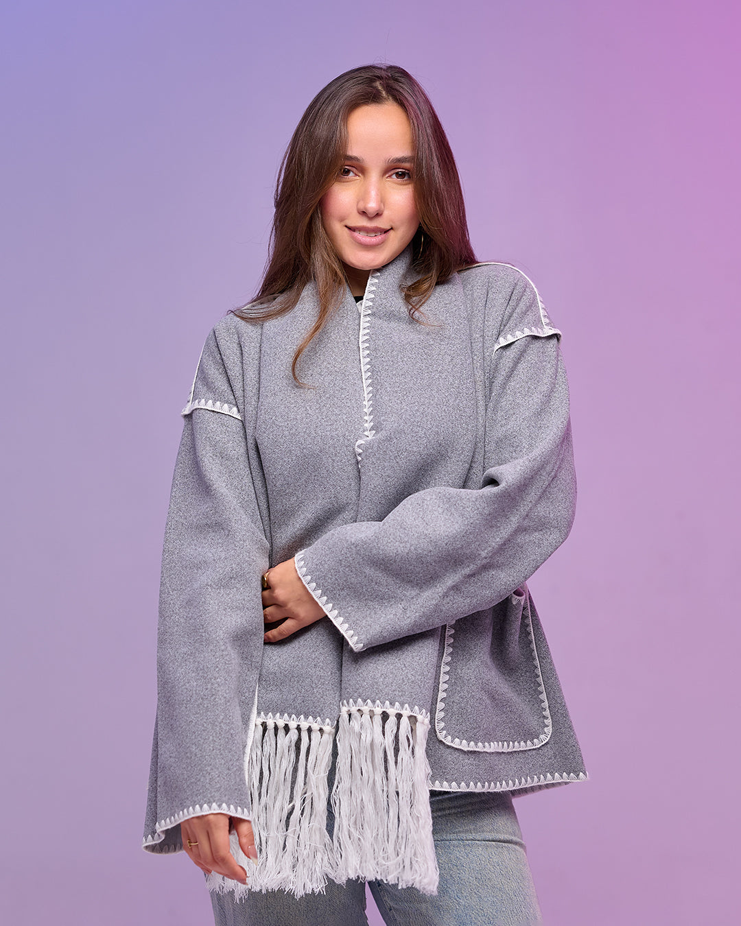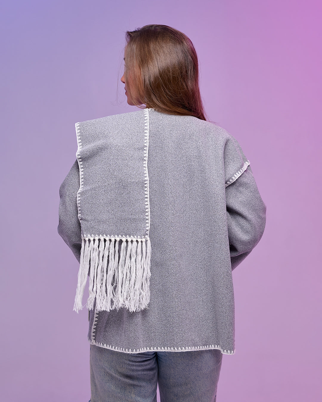 This jacket has embroidered edges with woolen threads and comes with a fringed scarf, adding a stylish and cozy touch.
