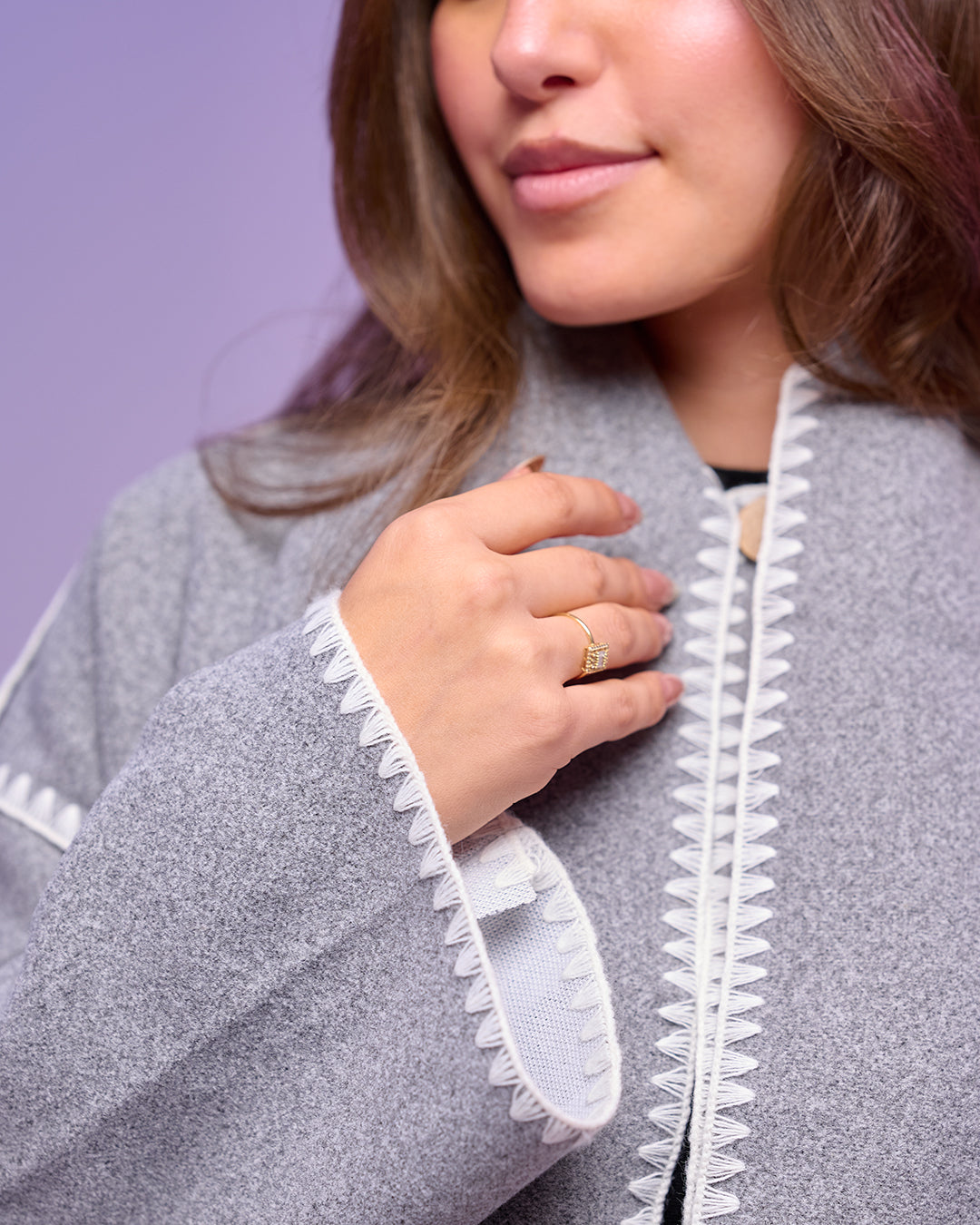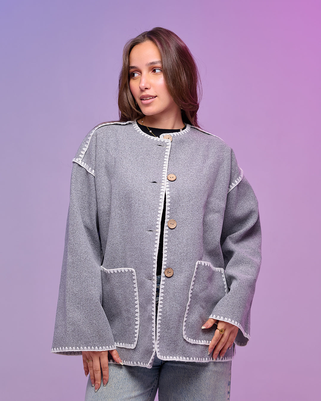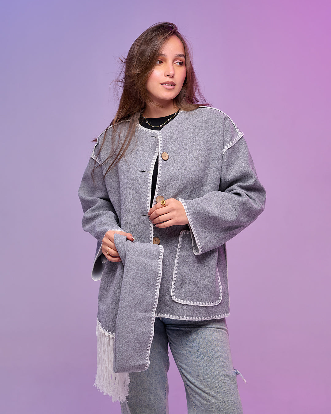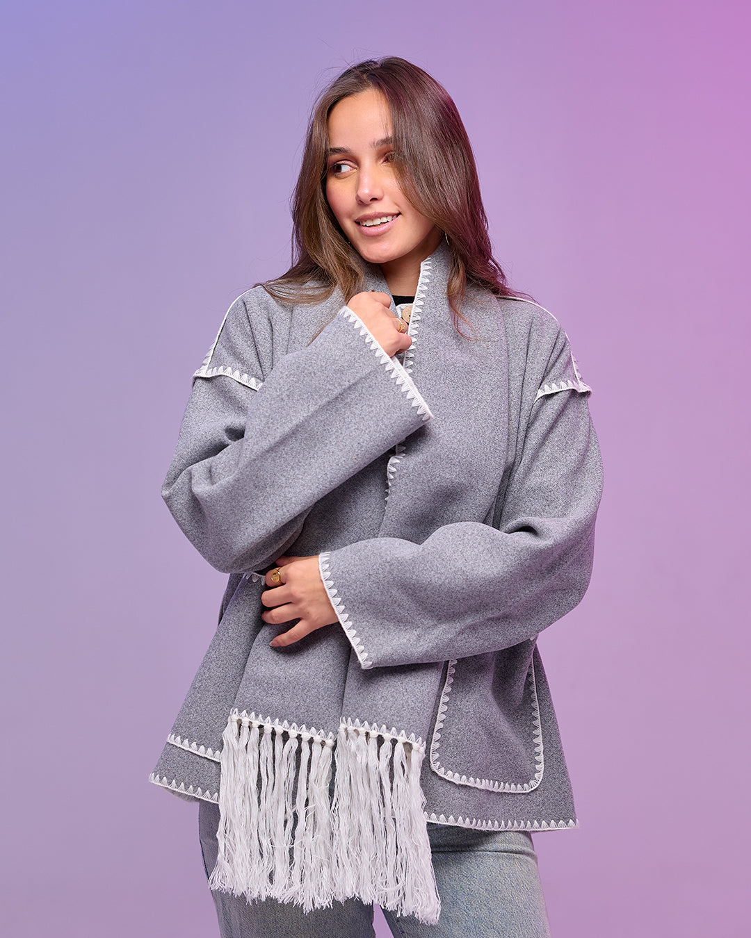This jacket has embroidered edges with woolen threads and comes with a fringed scarf, adding a stylish and cozy touch.