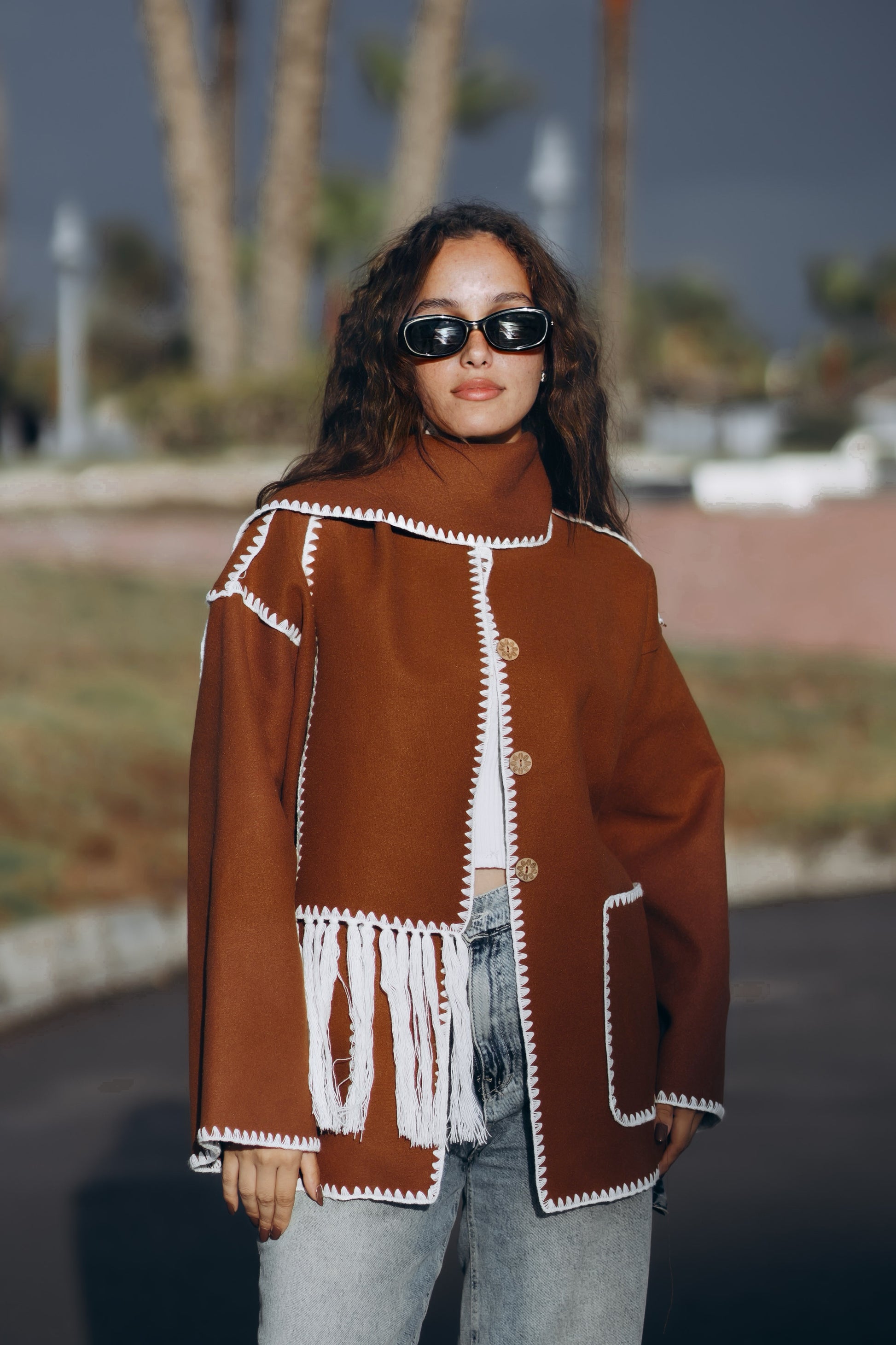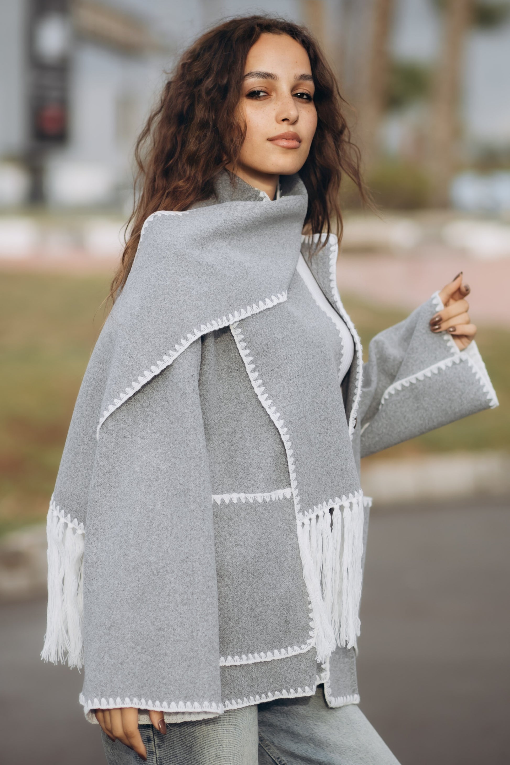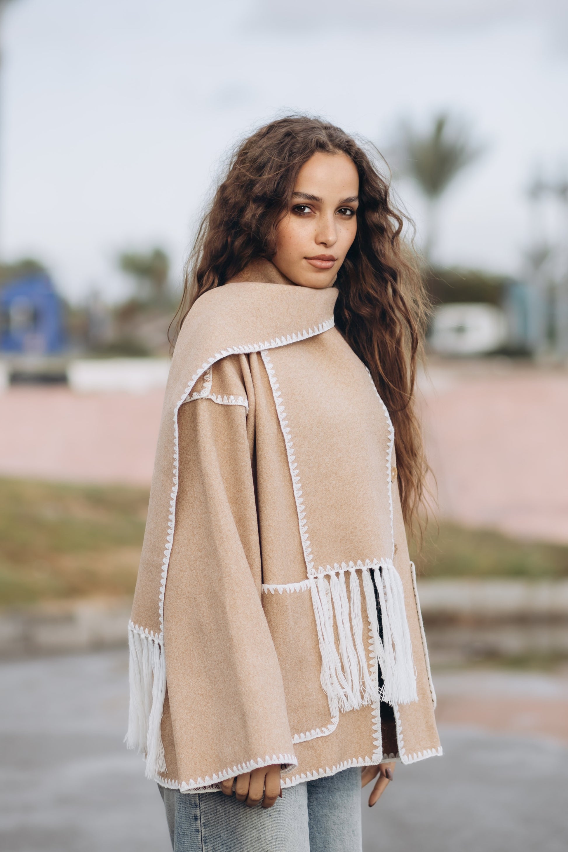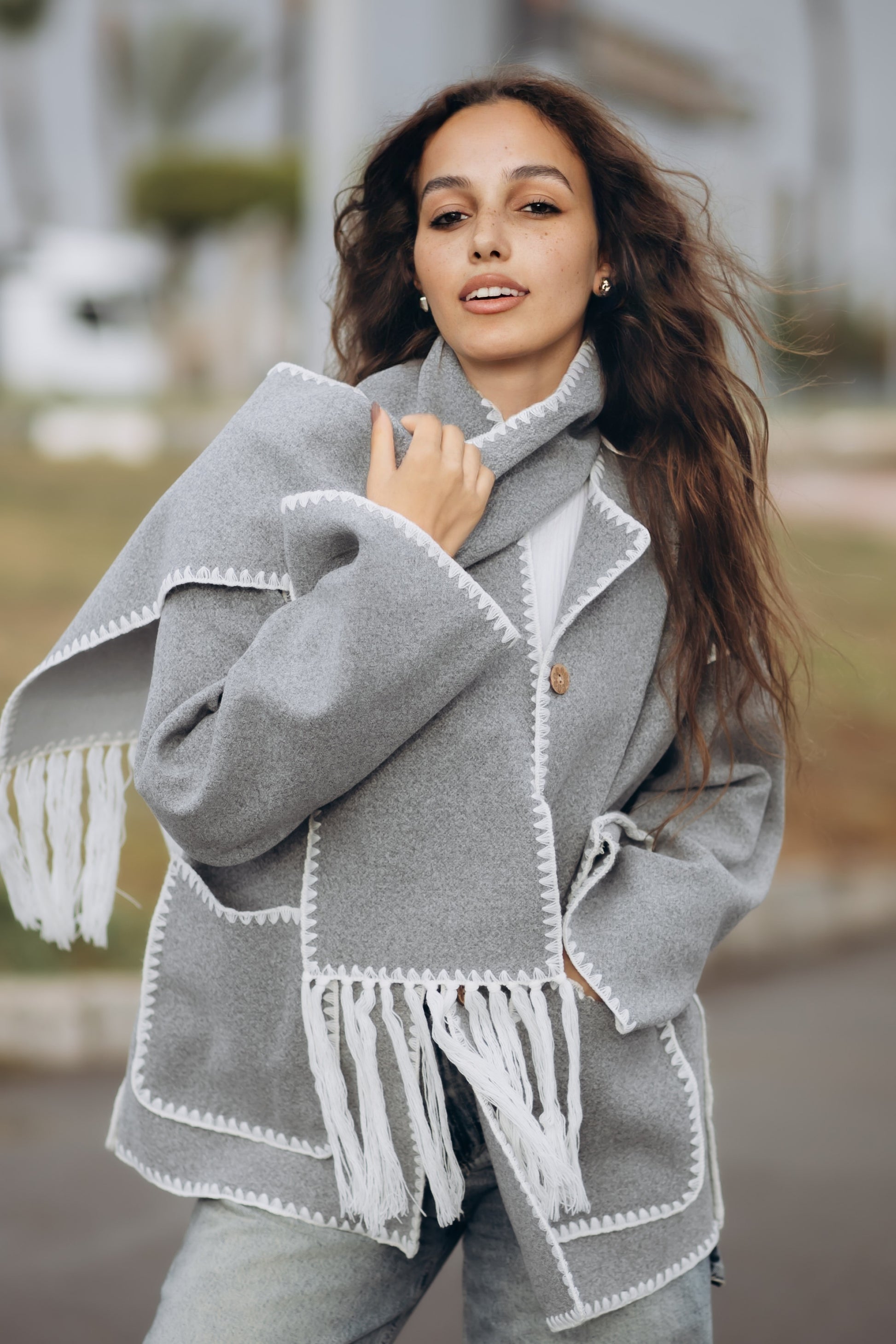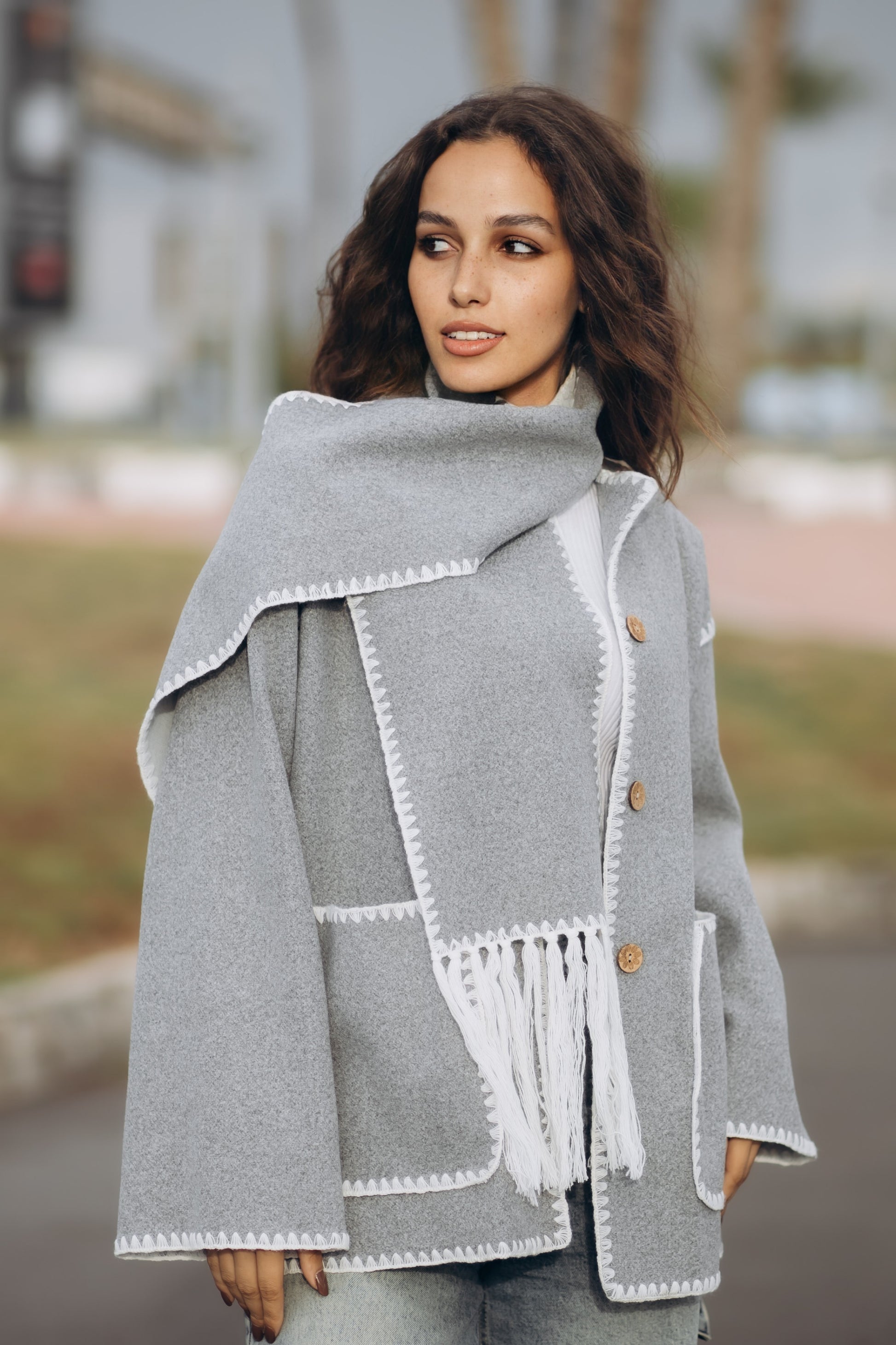 This jacket has embroidered edges with woolen threads and comes with a fringed scarf, adding a stylish and cozy touch.