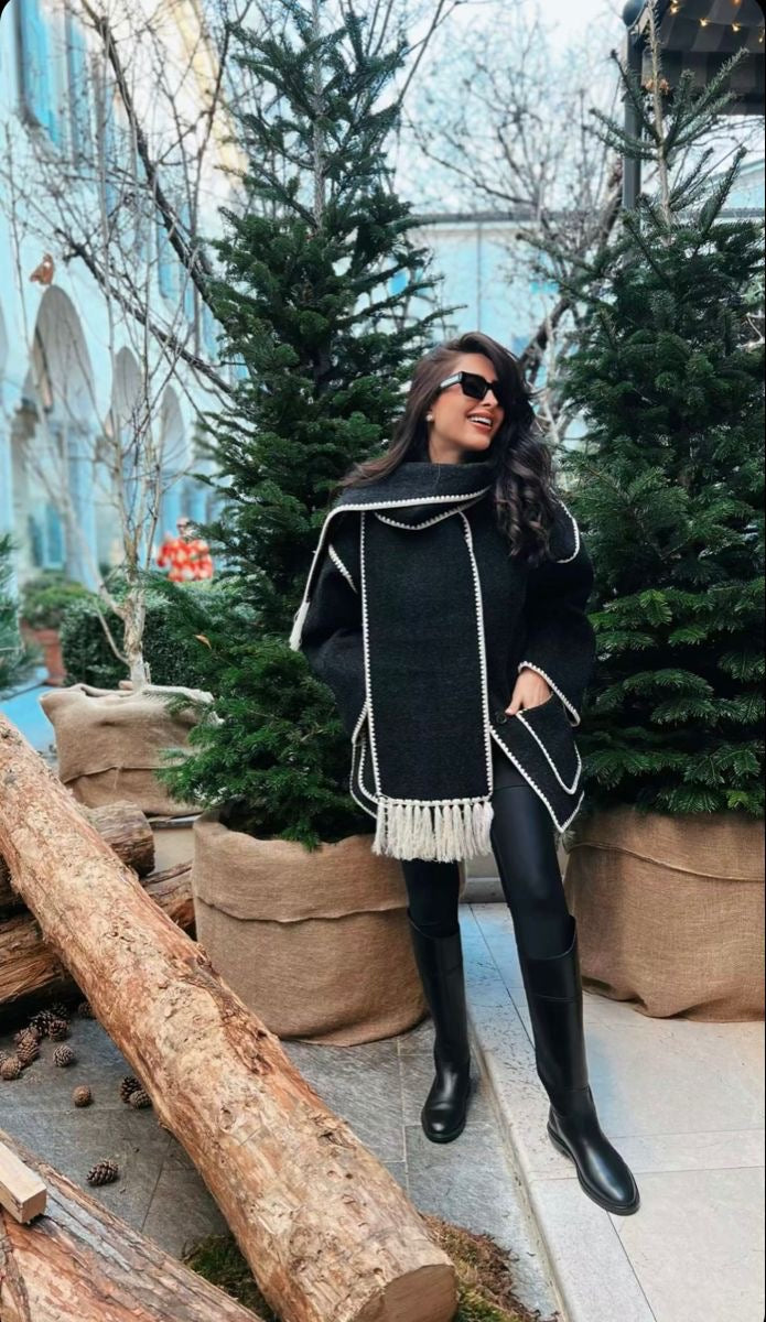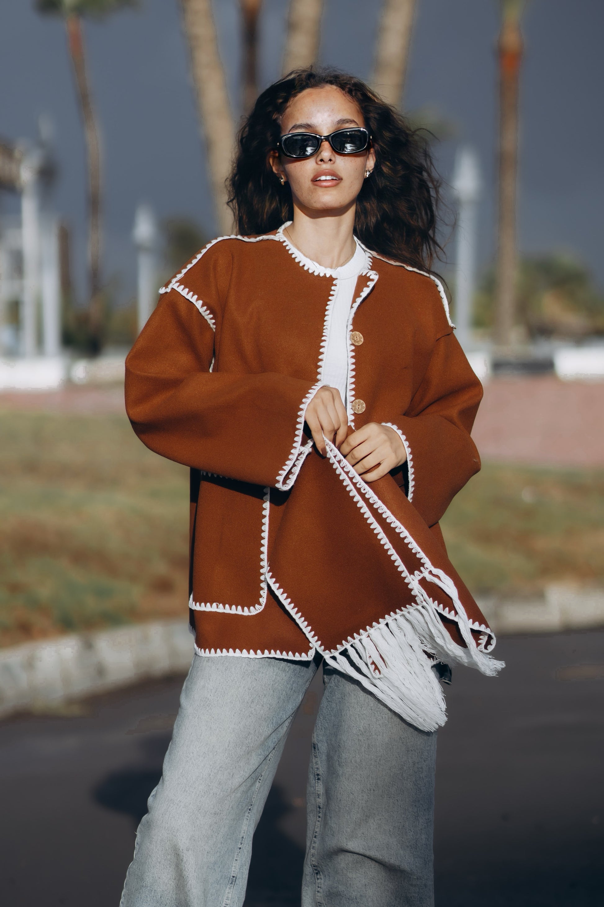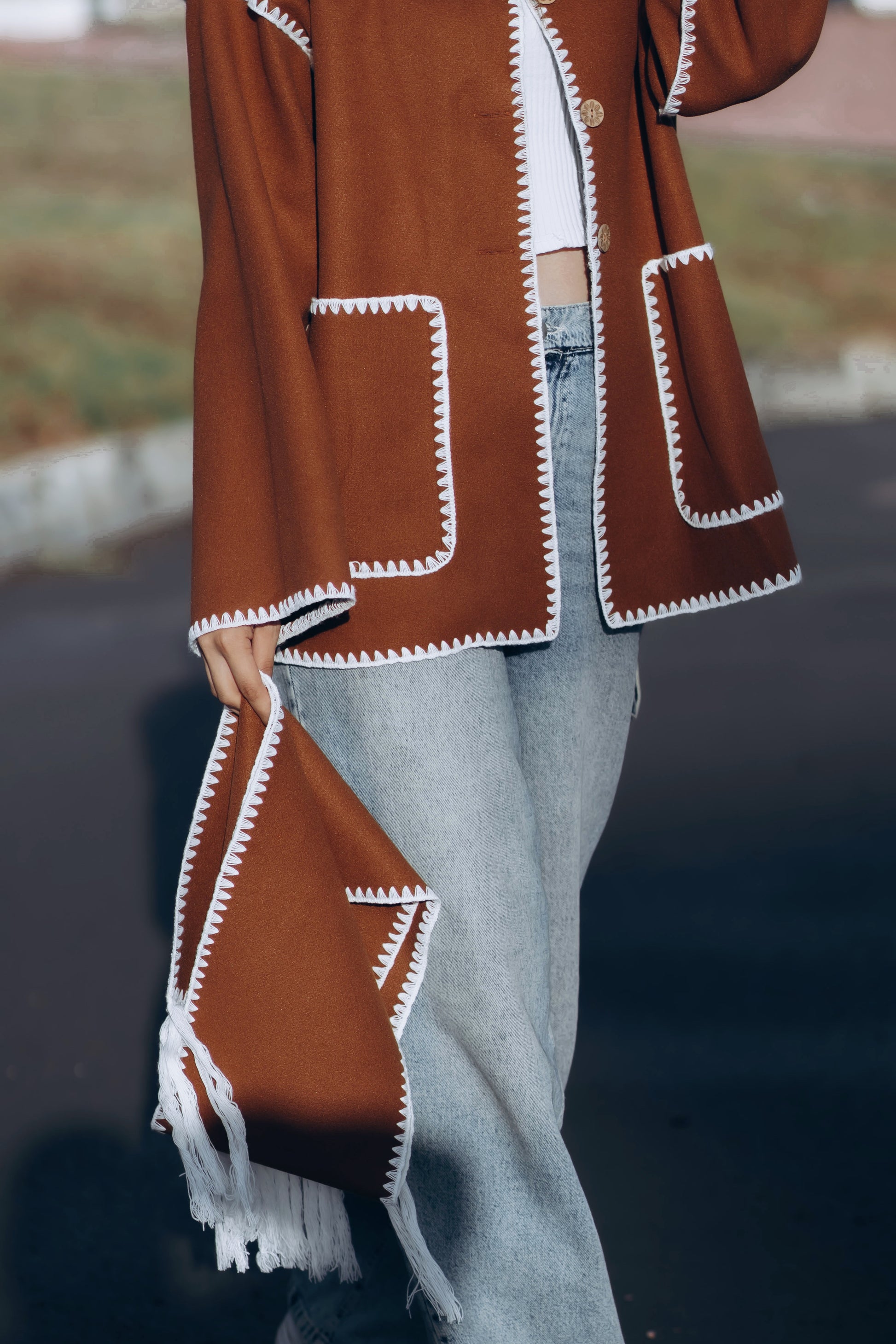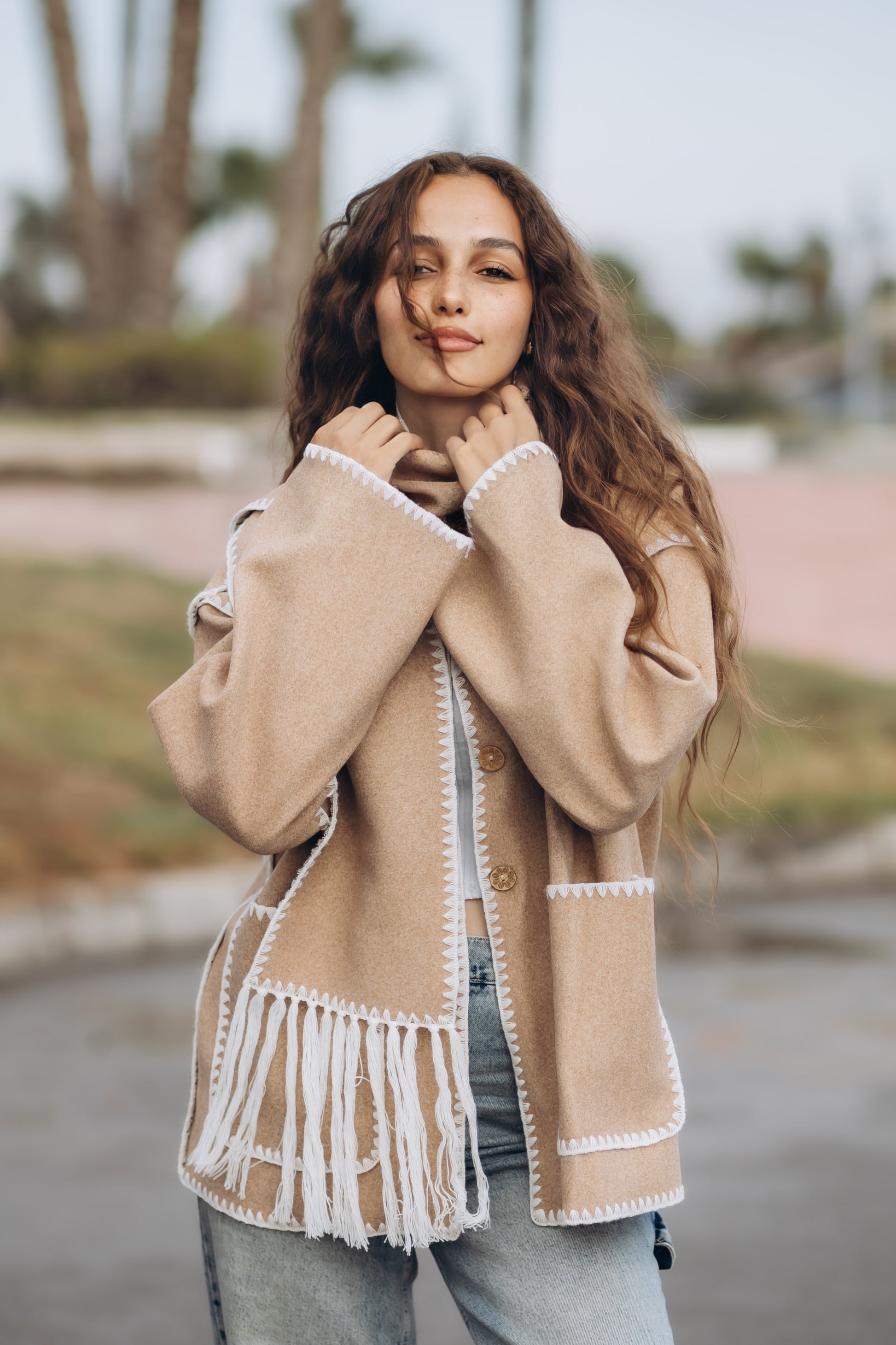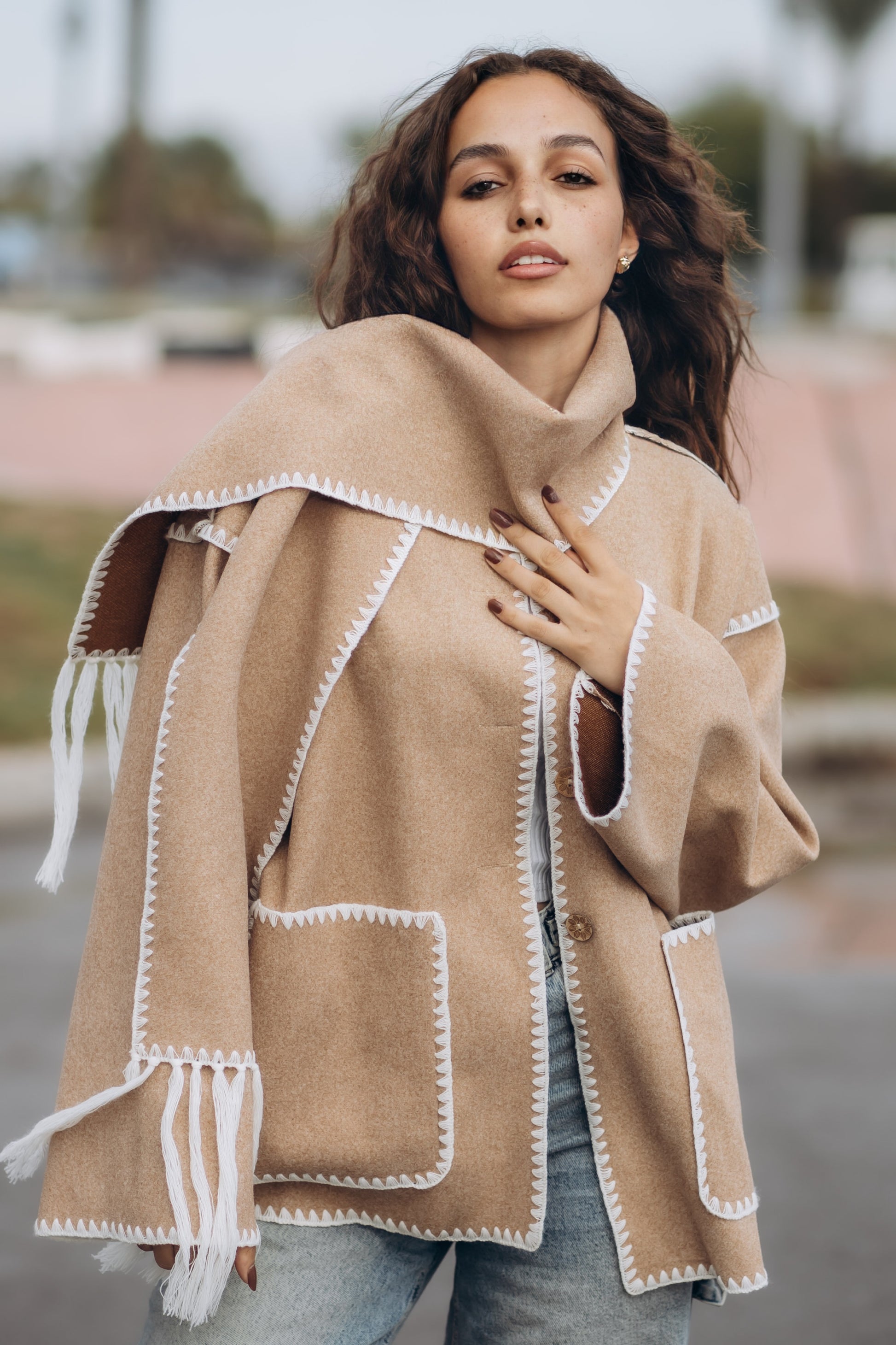This jacket has embroidered edges with woolen threads and comes with a fringed scarf, adding a stylish and cozy touch.