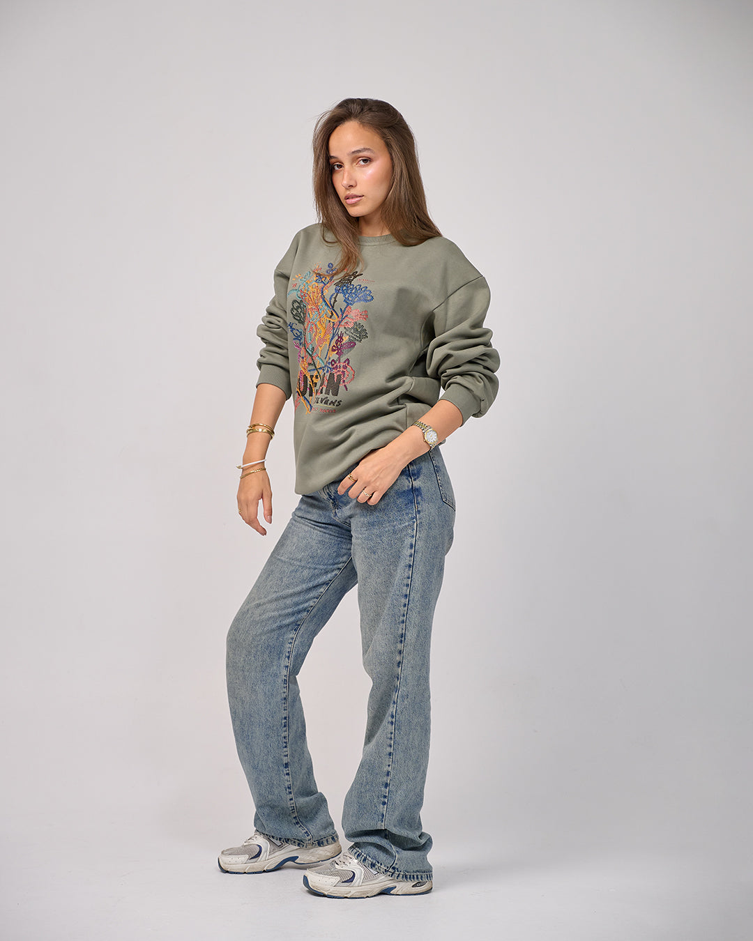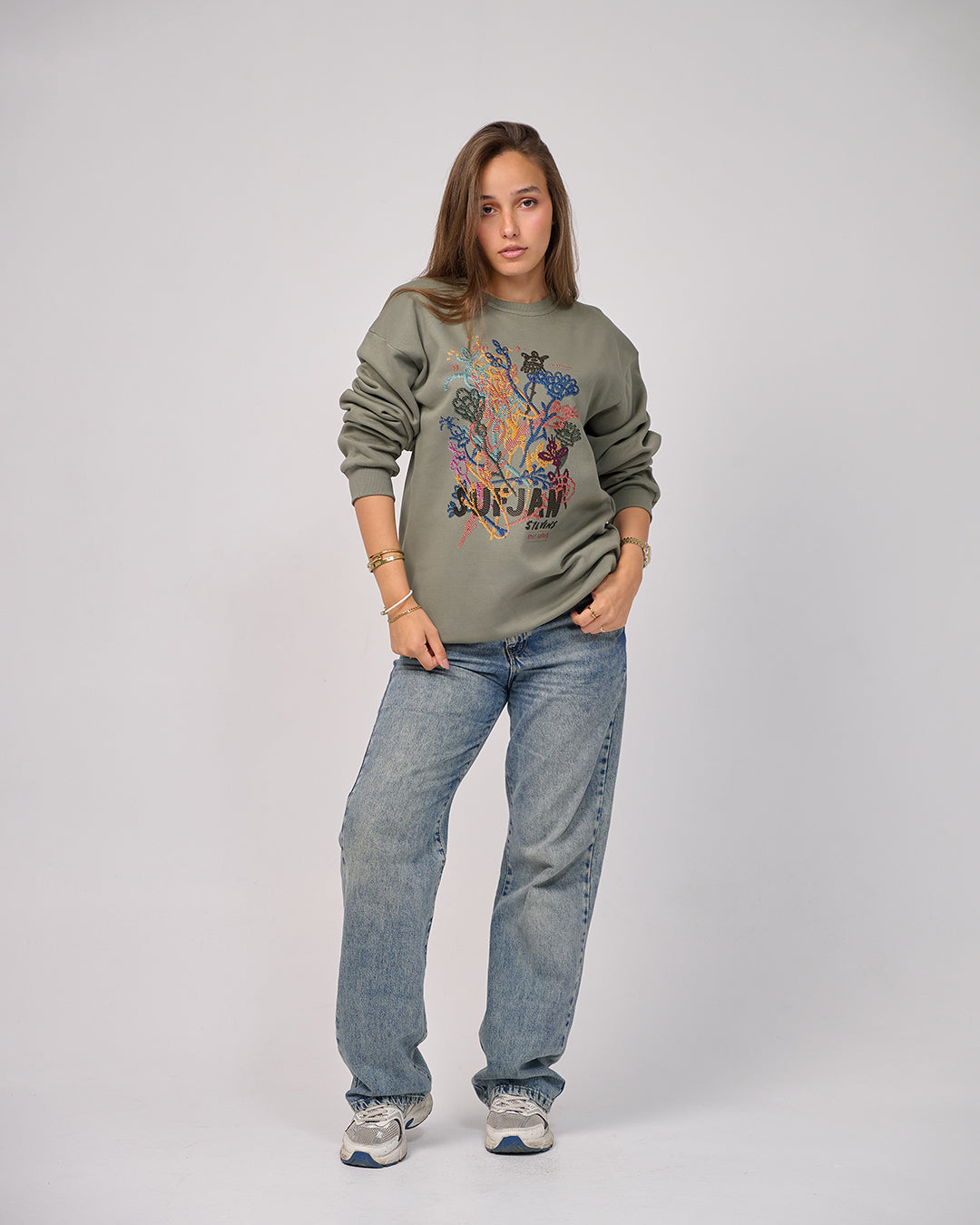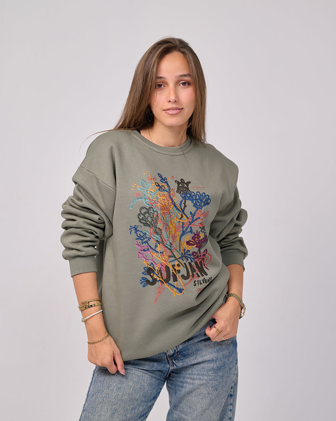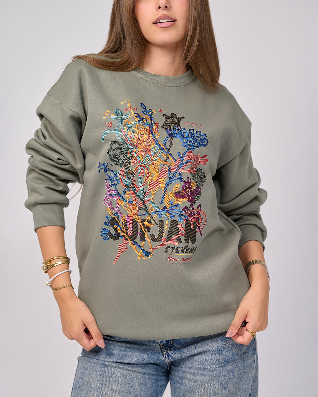 A cozy, playful sweatshirt that mixes comfort, warmth, and unique embroidered-effect artwork.