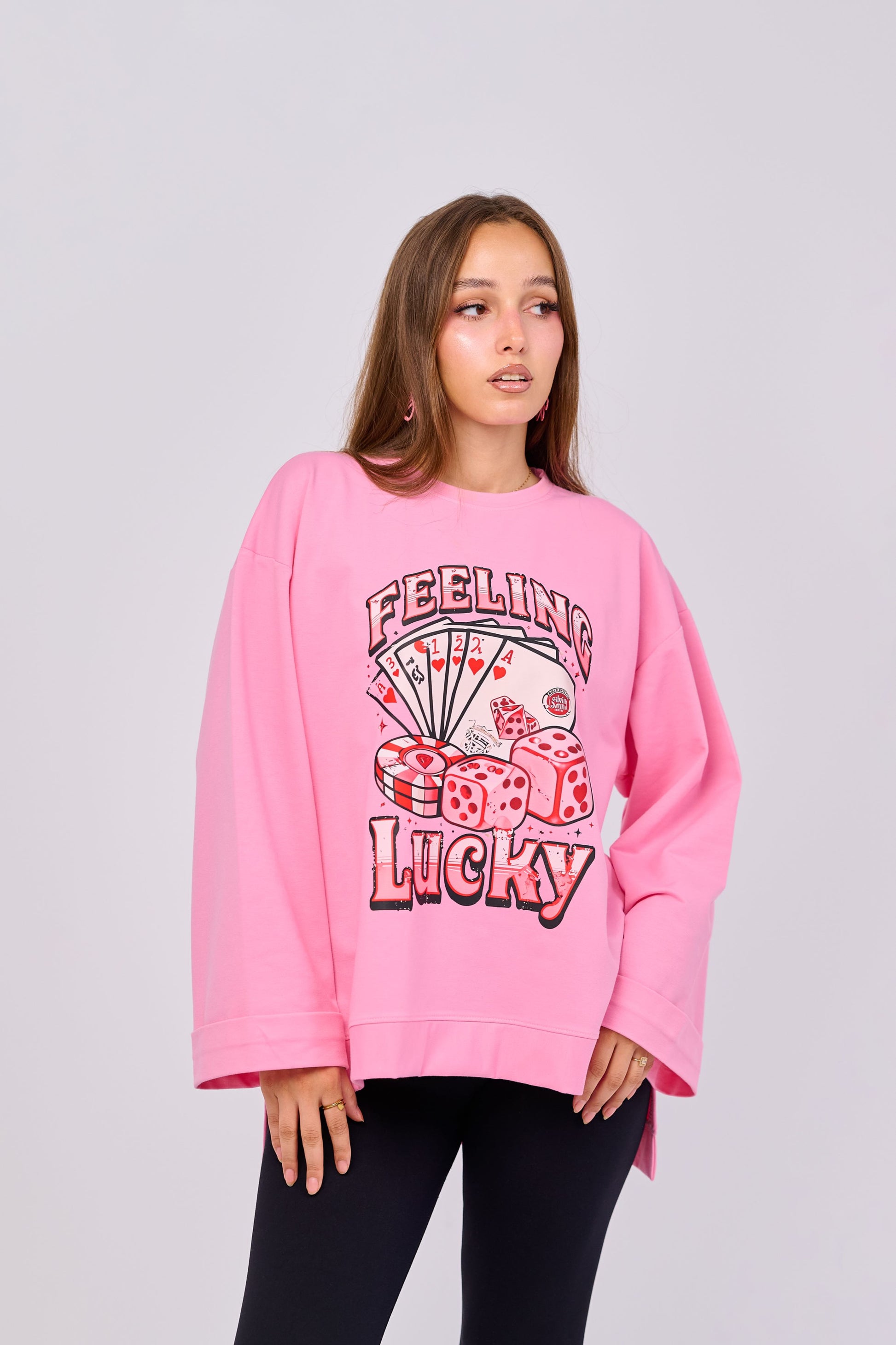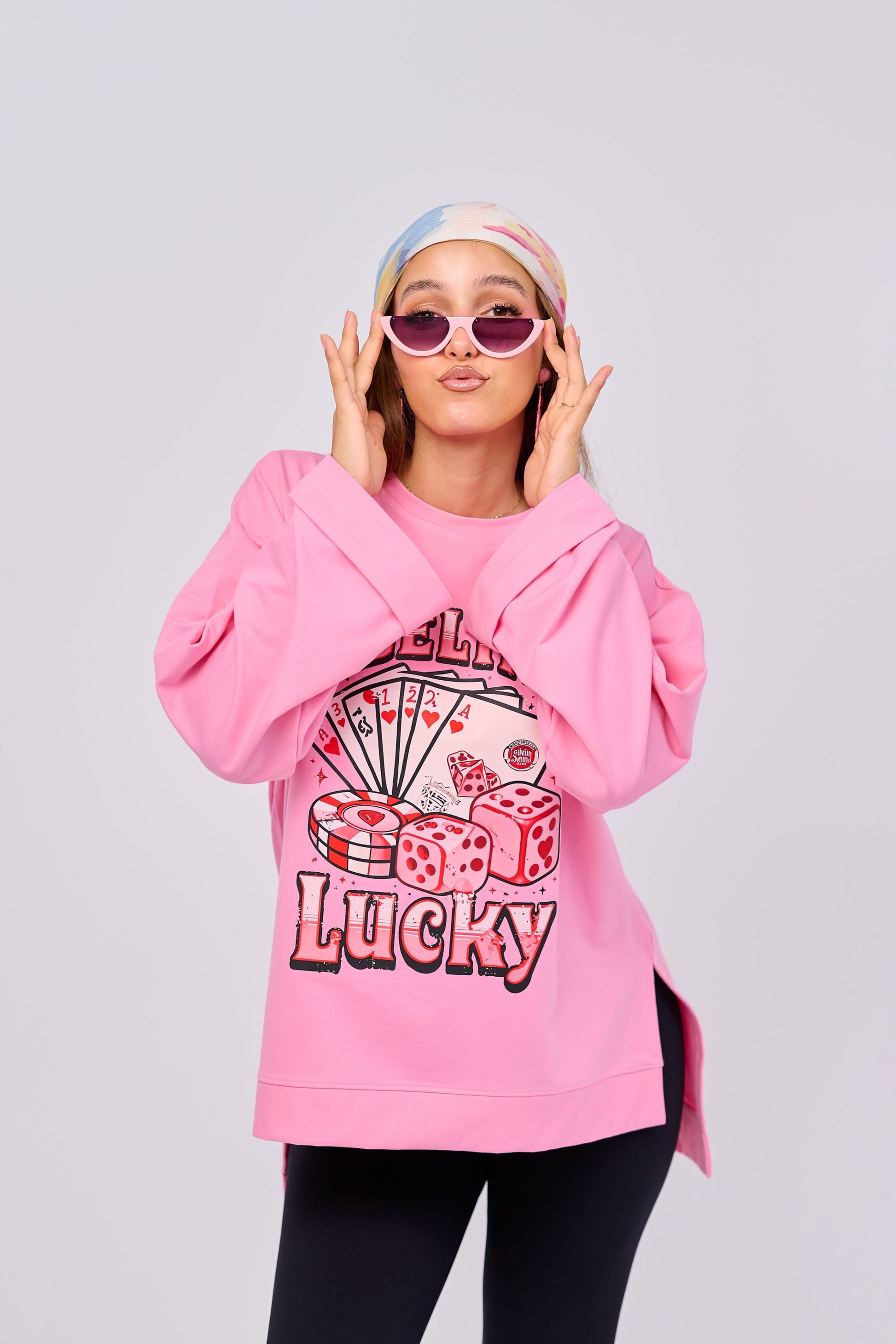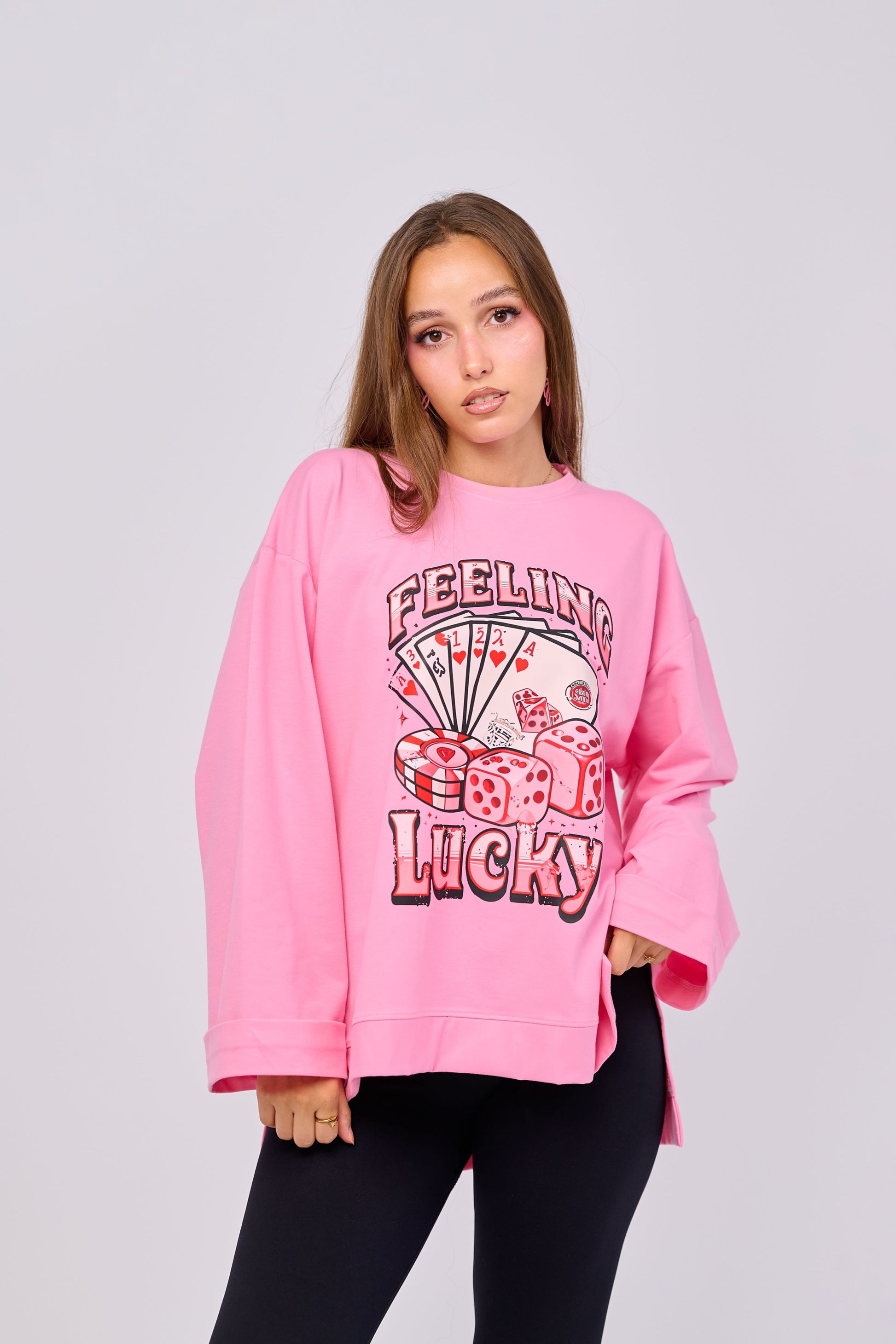 Feeling lucky – Oversized Printed Cotton T-shirt | 100% Comfy Fabric – Long Back with Side Slits