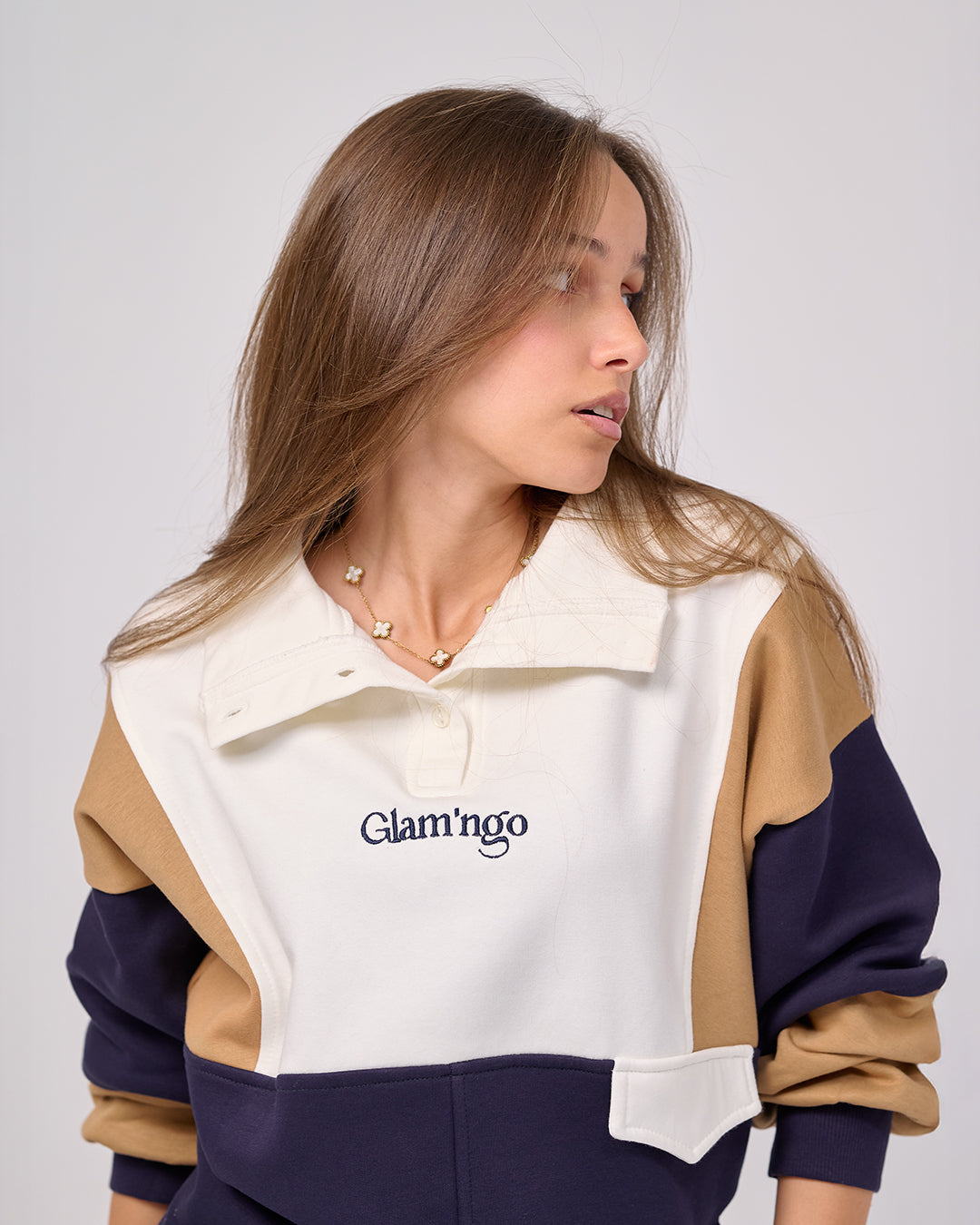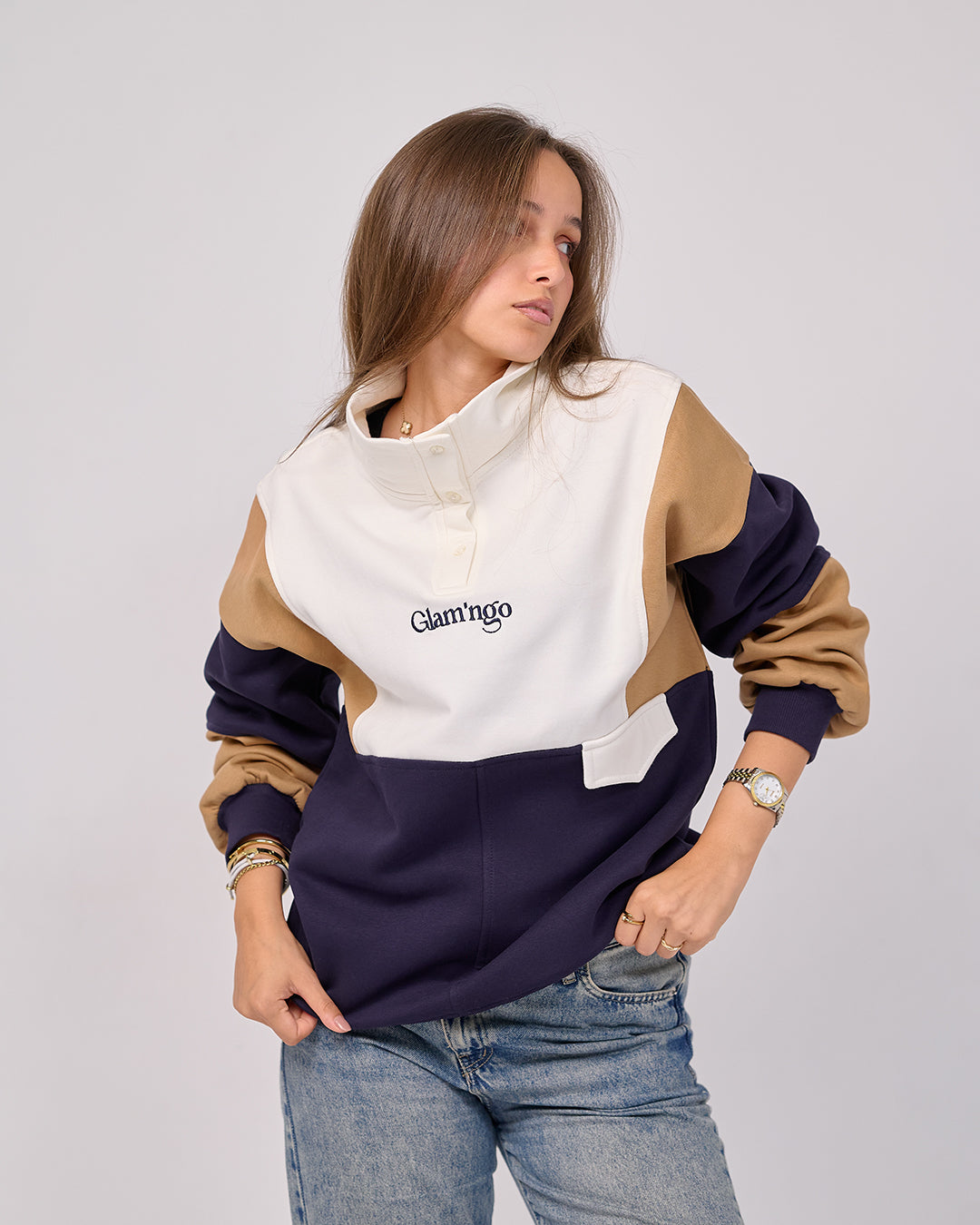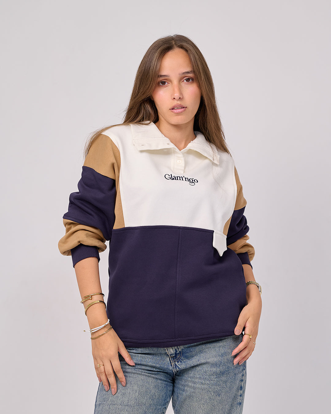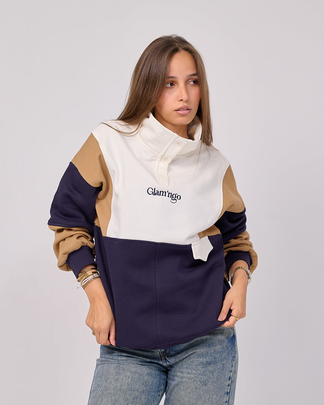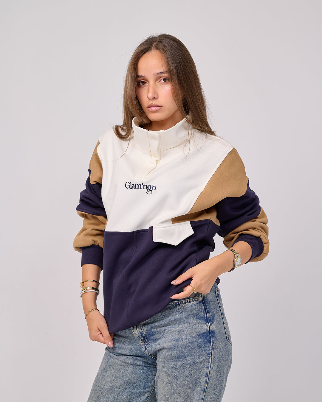 • Cream / Caramel / Navy – Color-Block