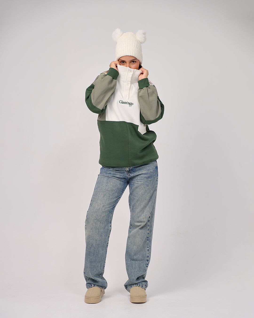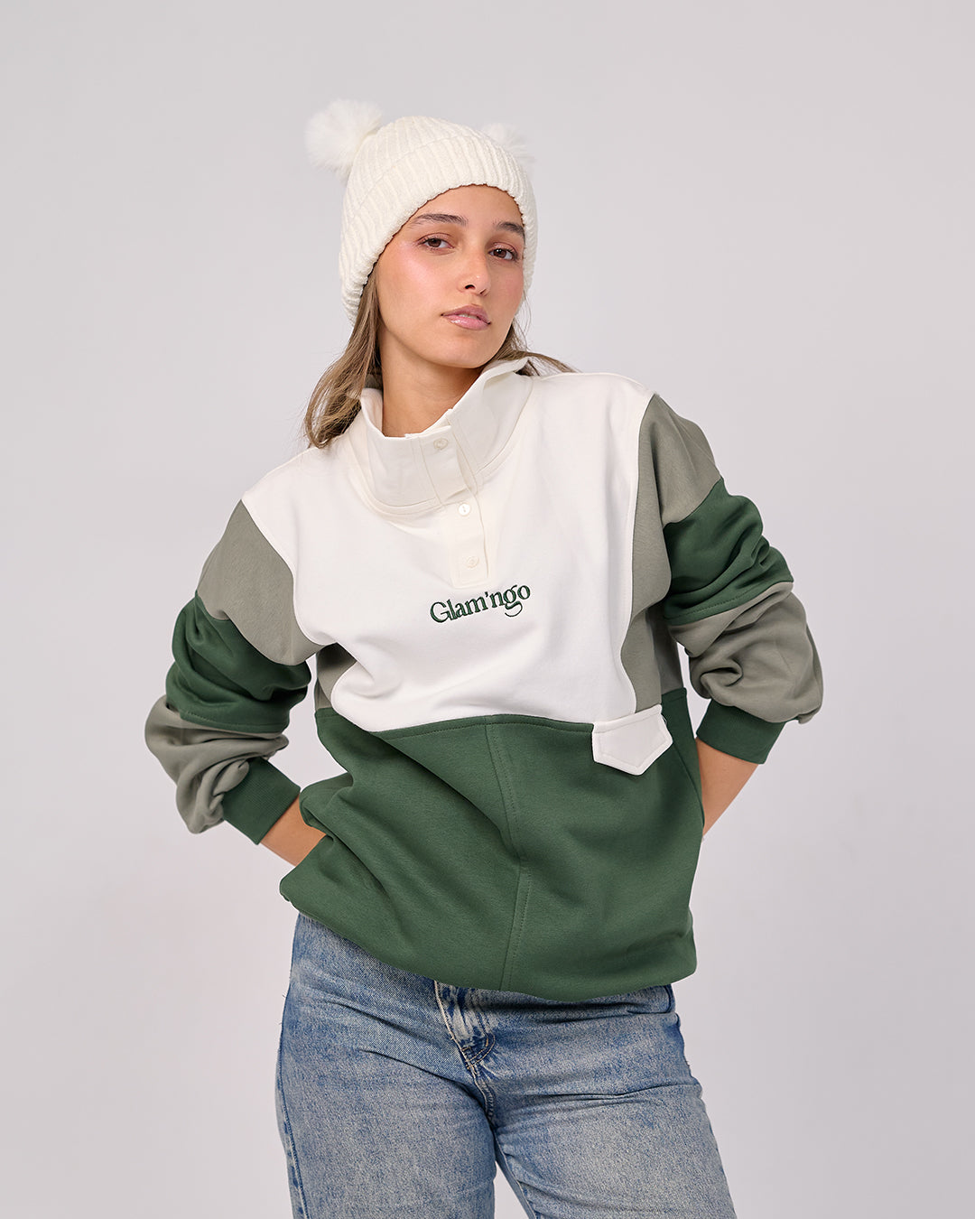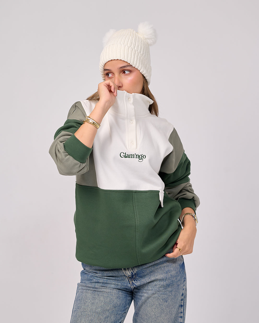 Glam’ngo Cozy Oversized Color-Block Sweatshirt with Stitched Logo " cream olive"