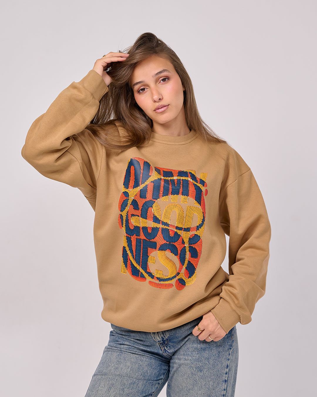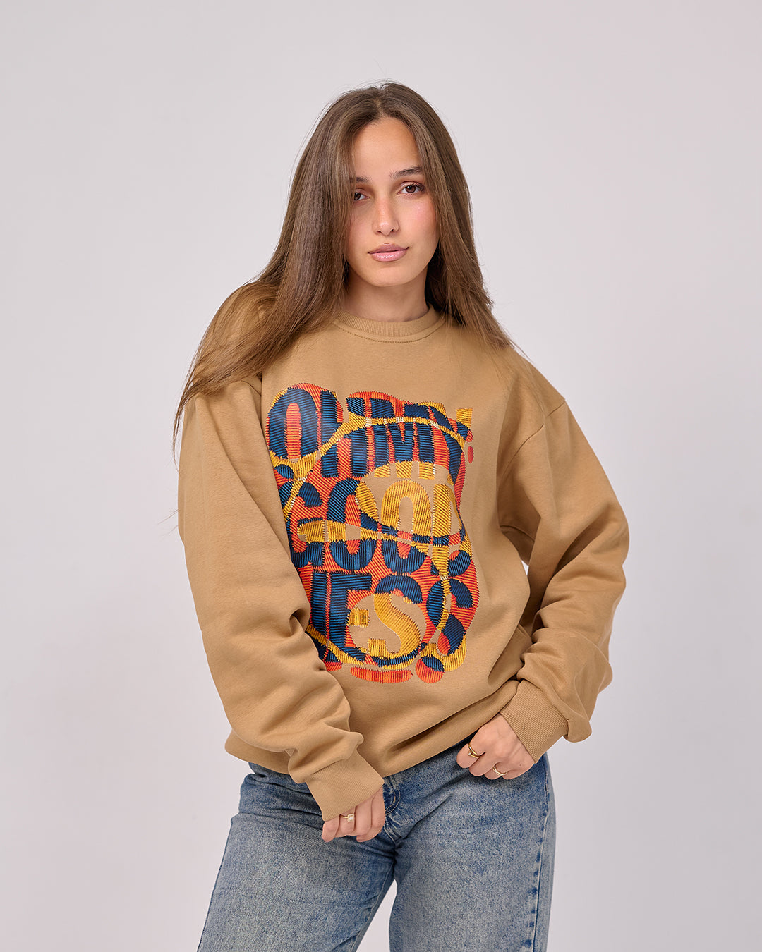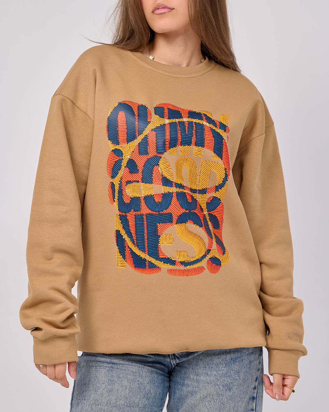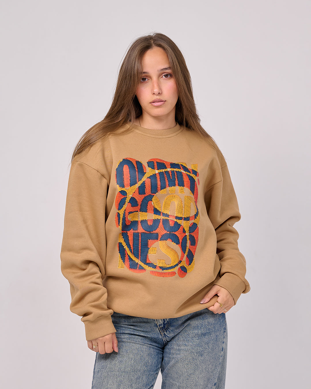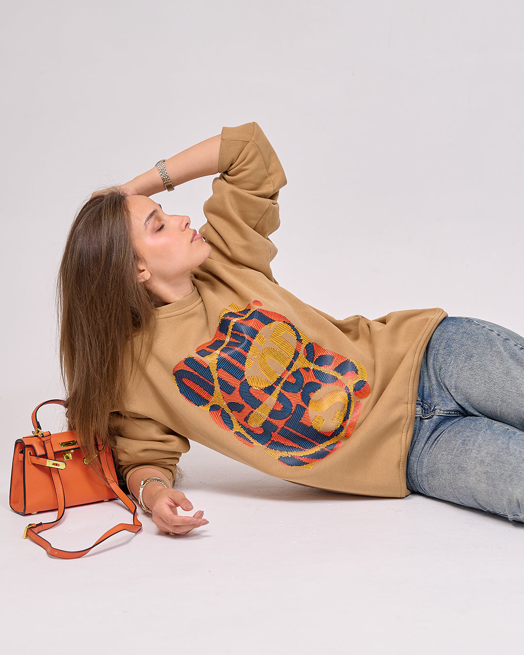 A cozy, playful sweatshirt that mixes comfort, warmth, and unique embroidered-effect artwork.